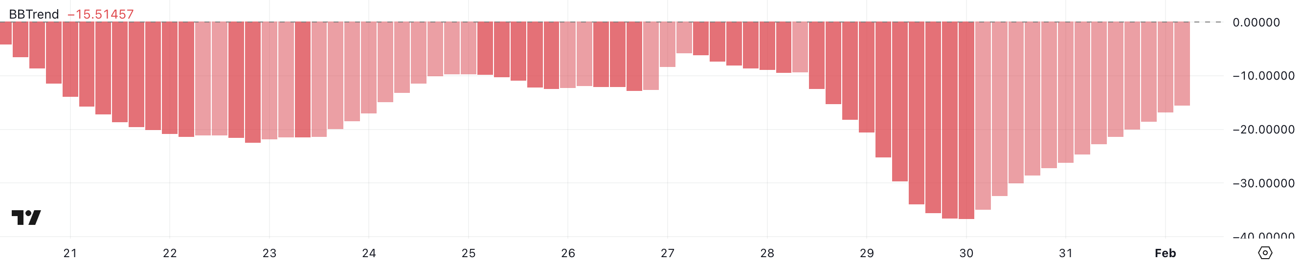 BBTrend (Bollinger Band Trend) Bollinger Bands негізінде трендтің күшін және бағытын өлшейтін индикатор. Оң мәндер жоғары трендті, ал теріс мәндер төмендеу трендін білдіреді, ал неғұрлым экстремалды көрсеткіштер кез келген бағытта күшті импульсті көрсетеді.