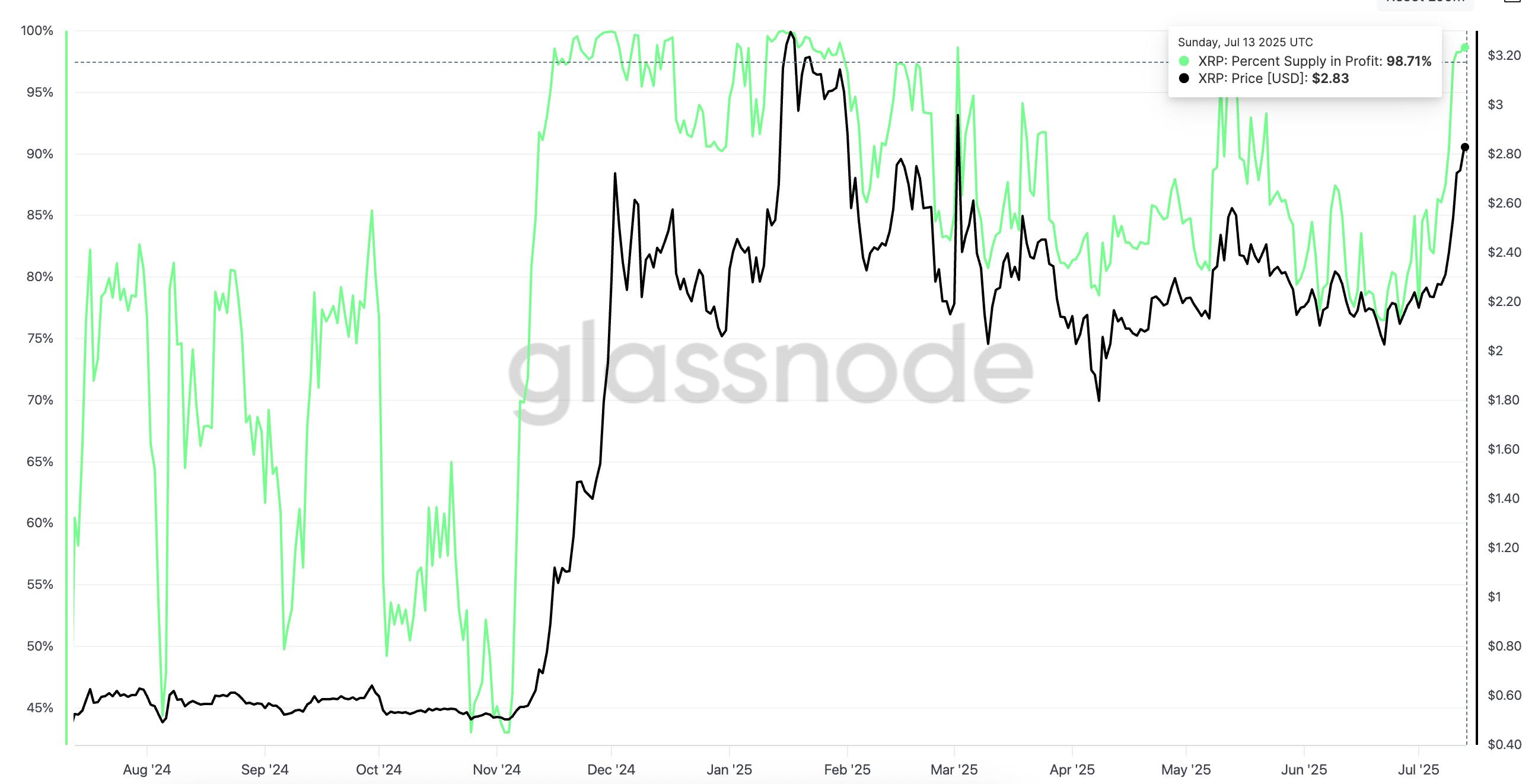 Қазіргі уақытта айналымдағы барлық XRP-дің 98%-дан астамы пайдада. Бұл дегеніміз, көпшілік иелер өздерінің XRP-ін төмен бағамен сатып алып, қазір пайда көріп отыр.