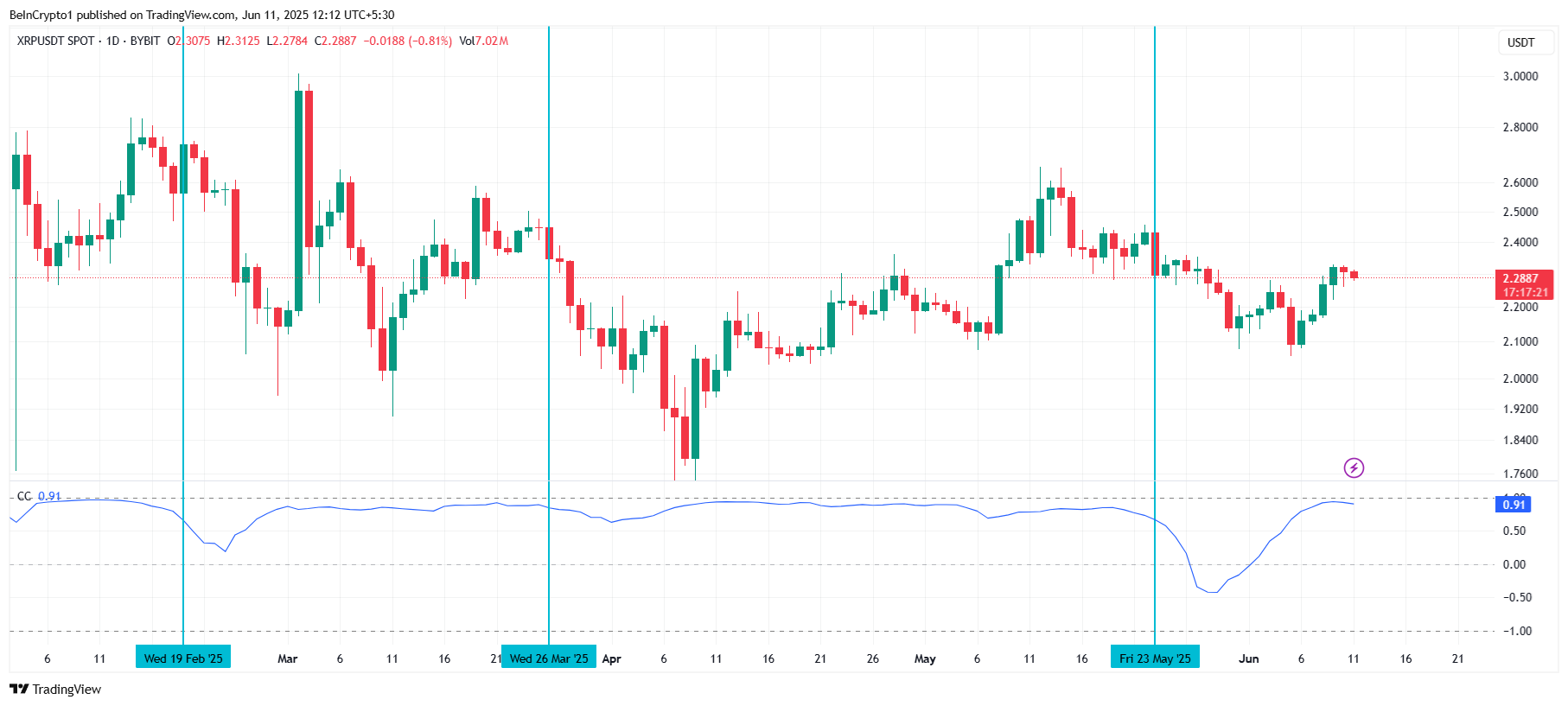 XRP қазіргі уақытта Bitcoin-мен 0,91 корреляциясын көрсетіп отыр, бұл екі активтің баға қозғалыстарының тығыз байланысын көрсетеді. Тарихи тұрғыдан алғанда, XRP-нің Bitcoin-мен корреляциясы әлсірегенде, альткоин бағаның төмендеуін бастан кешіреді. Алайда, корреляция күшейген сайын, XRP Bitcoin-нің жоғары импульсінен пайда көреді.