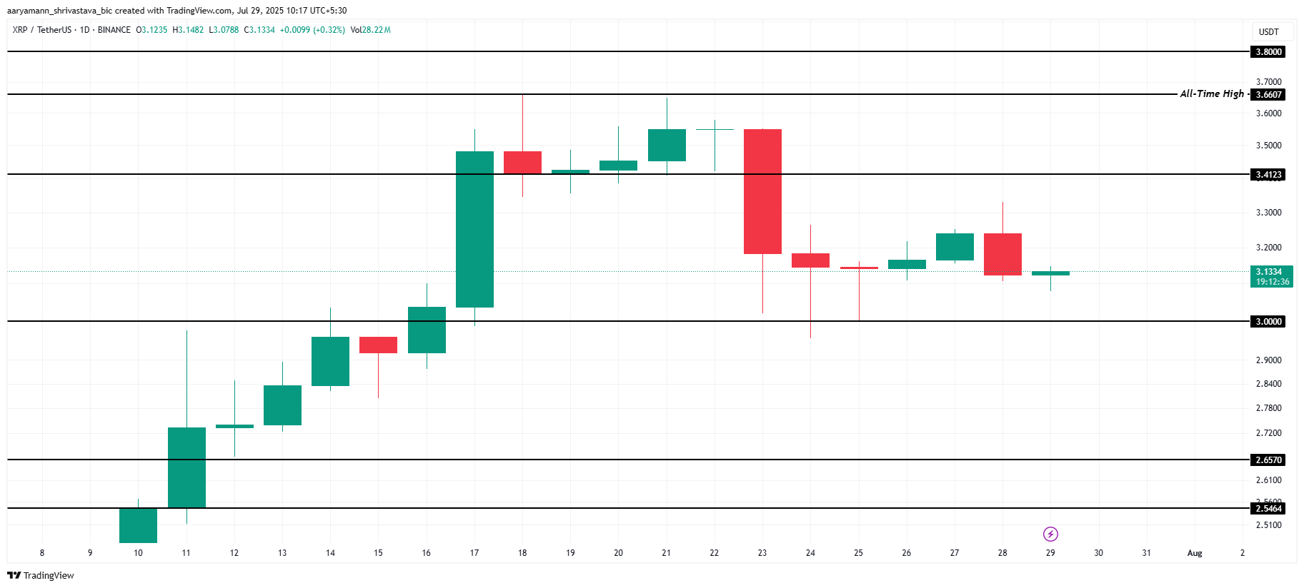 XRP жақында өзінің тарихи максимумынан (ATH) күрт төмендеді, бағасы бүйірлік трендте тұрақтанды.