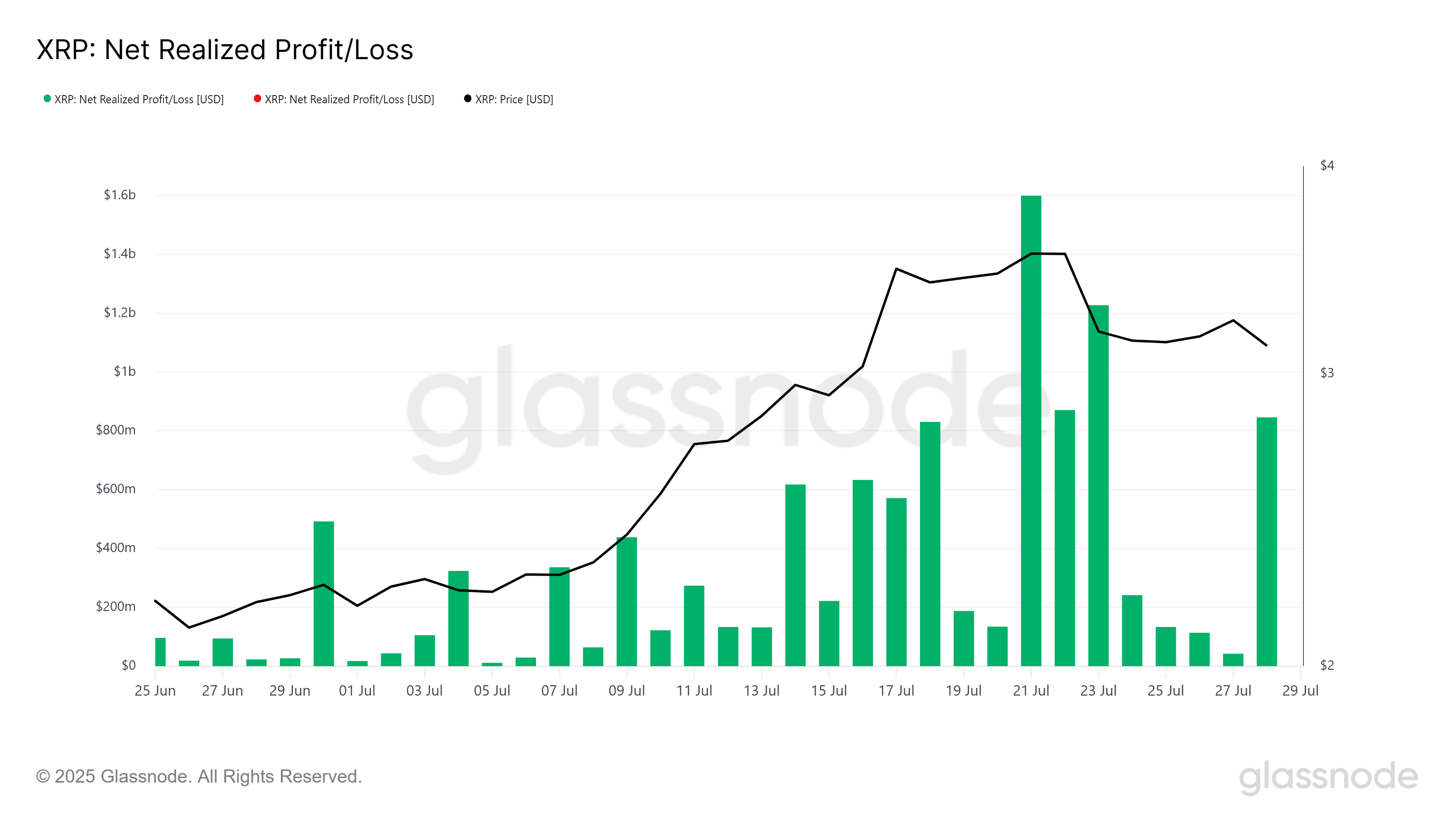 Таза жүзеге асырылған пайда/шығын көрсеткіші соңғы 24 сағат ішінде 845 млн доллар көлемінде сатылымдарды көрсетті, бұл айдағы ең жоғары бір күндік сатылымдардың бірі болып табылады. Бұл жоғары сату көлемі көптеген XRP инвесторларының монетаның тұрақтылығына әлі де сенімсіз екенін көрсетеді.