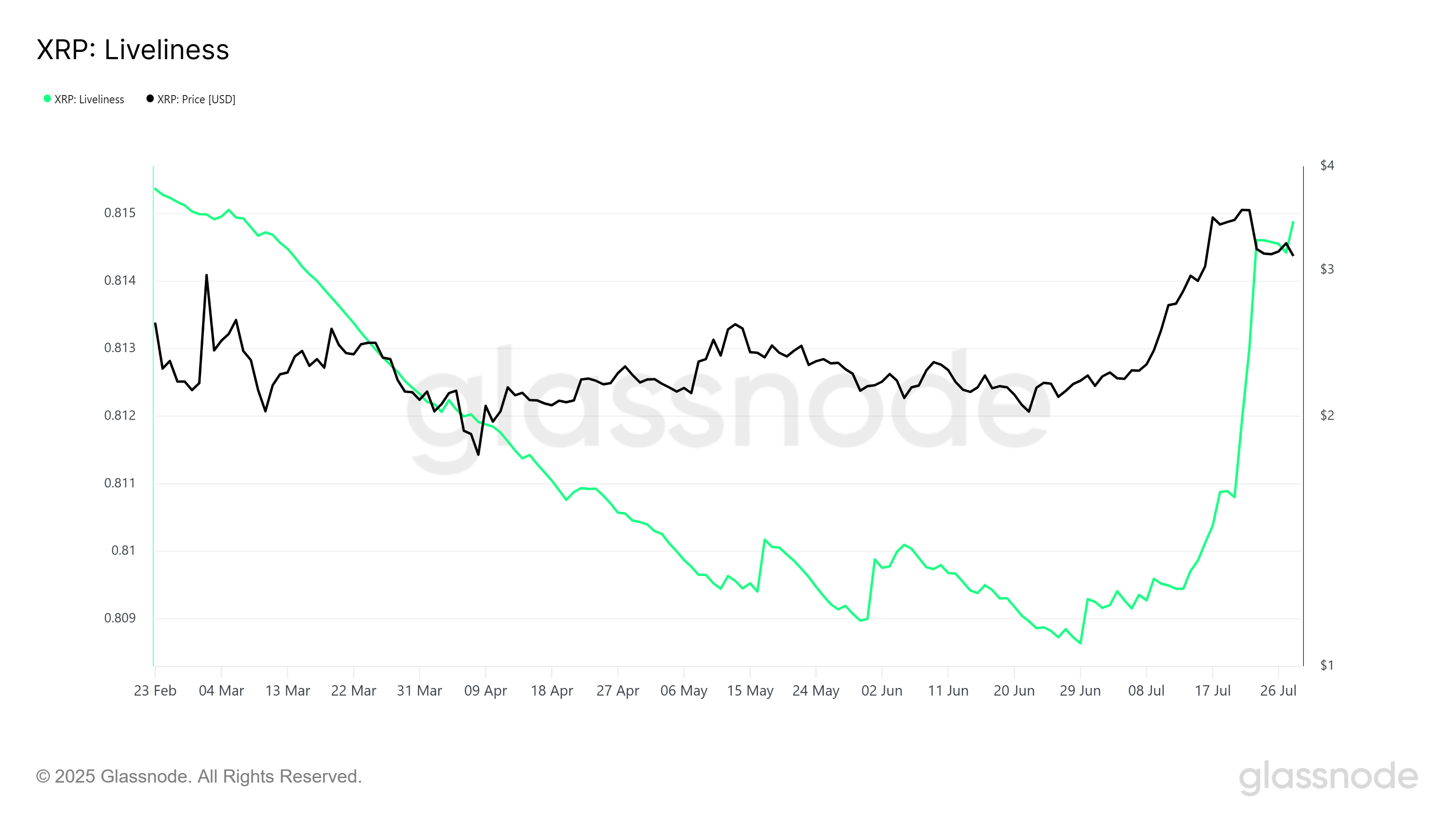 XRP-дің макро импульсі ұзақ мерзімді иелердің (LTHs) қозғалысын бақылайтын Liveliness-тің соңғы өсуімен қатты әсер етуде. Қазіргі уақытта Liveliness төрт айлық ең жоғары деңгейде тұр, бұл көптеген ұзақ мерзімді иелердің өз XRP-ін сататынын көрсетеді. Жинақтаудан таратуға ауысу бағаға теріс әсер етуі мүмкін, өйткені LTHs әдетте XRP құнына айтарлықтай әсер етеді.