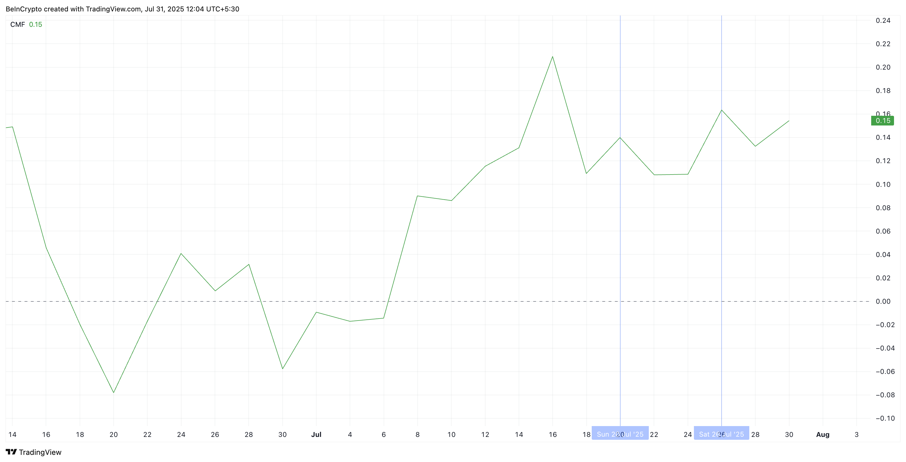 Бақылауға тұрарлық негізгі белгі – Чайкин ақша ағыны (CMF). Бұл индикатор баға әрекеті мен сауда көлемін біріктіріп, ақша токенге кіріп жатқанын немесе шығып жатқанын бақылайды.