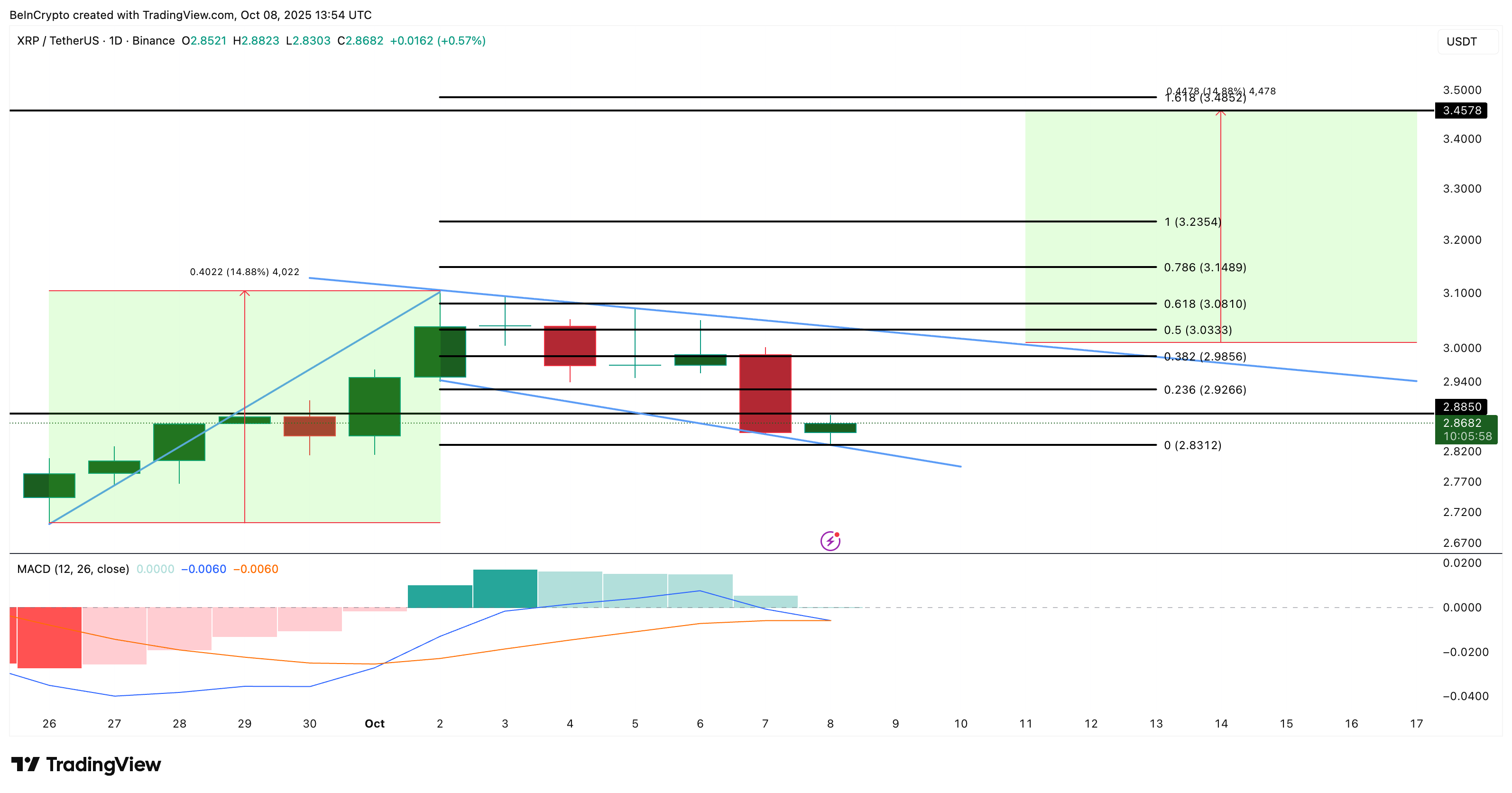 Егер бұл аю импульсі жалғаса берсе, XRP бағасы флагтың шамамен 2,83 доллар деңгейіндегі қолдау деңгейіне қарай шегінуі мүмкін.