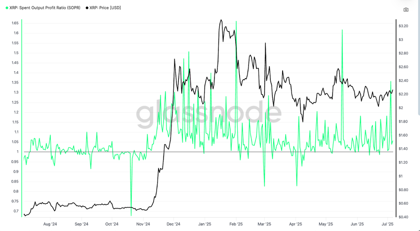 XRP-дің SOPR (Шығындалған Шығыс Пайда Коэффициенті) 2025 жылдың маусым айының басында 1,6-дан жоғары көтеріліп, әмияндардың пайдасын бекітіп жатқанын көрсетті. Тарихи тұрғыдан алғанда, мұндай деңгейлер жергілікті шыңдармен сәйкес келеді, әсіресе пайда алу 1,5-тен асқанда.