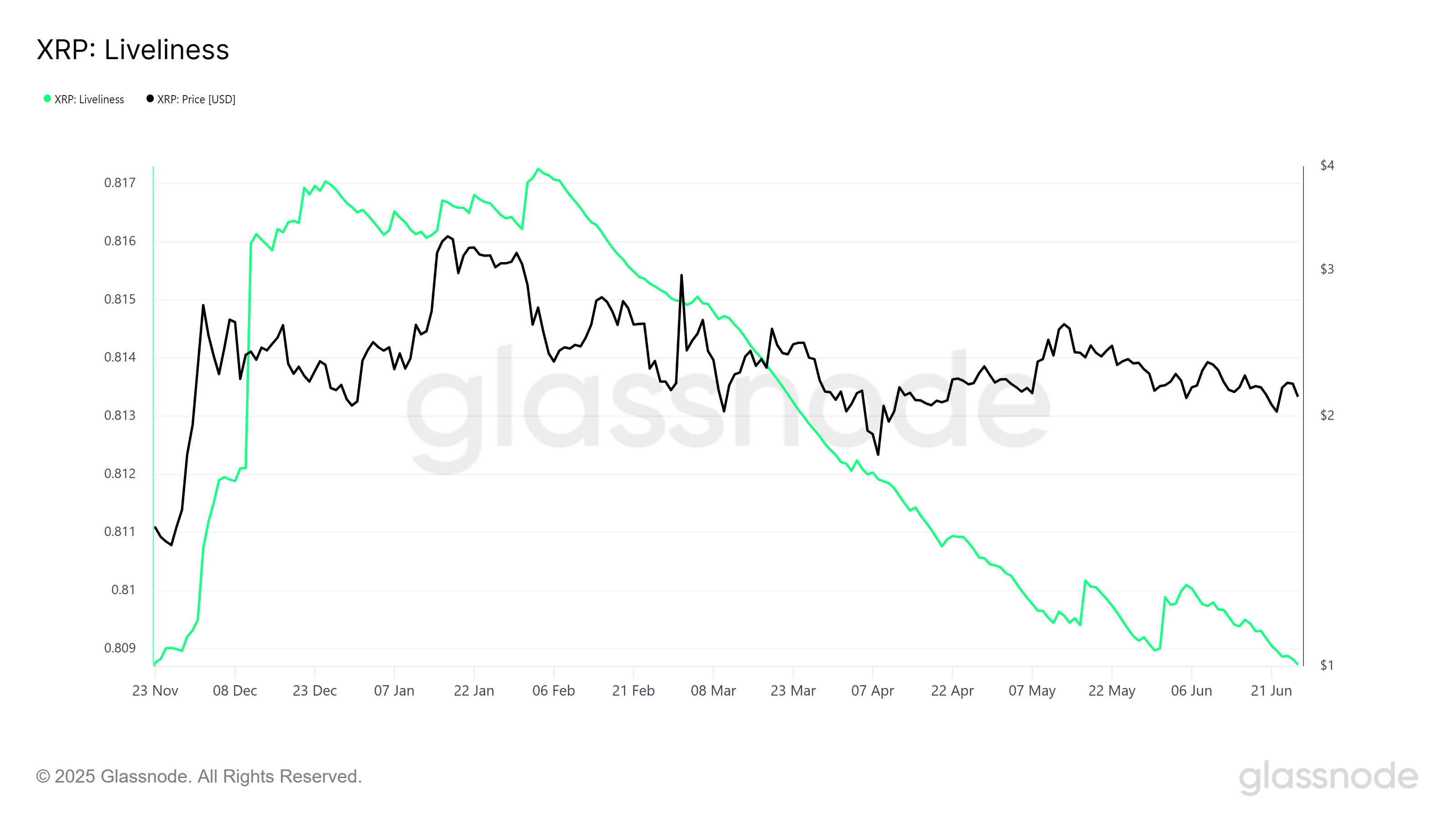 XRP үшін Liveliness индикаторы қазіргі уақытта тұрақты төмендеуде, бұл ұзақ мерзімді иелердің (LTHs) сатудан гөрі көбірек жинақтап жатқанын көрсетеді. Алты айлық ең төменгі деңгейде бұл индикатор LTHs-тің XRP-дің ұзақ мерзімді әлеуетіне сенімді екенін көрсетеді, бұл бағаға тұрақтандырушы әсер береді. LTHs өз позицияларын ұстап тұрғандықтан, бұл қолдау экстремалды құбылмалылыққа қарсы буфер бола алады.