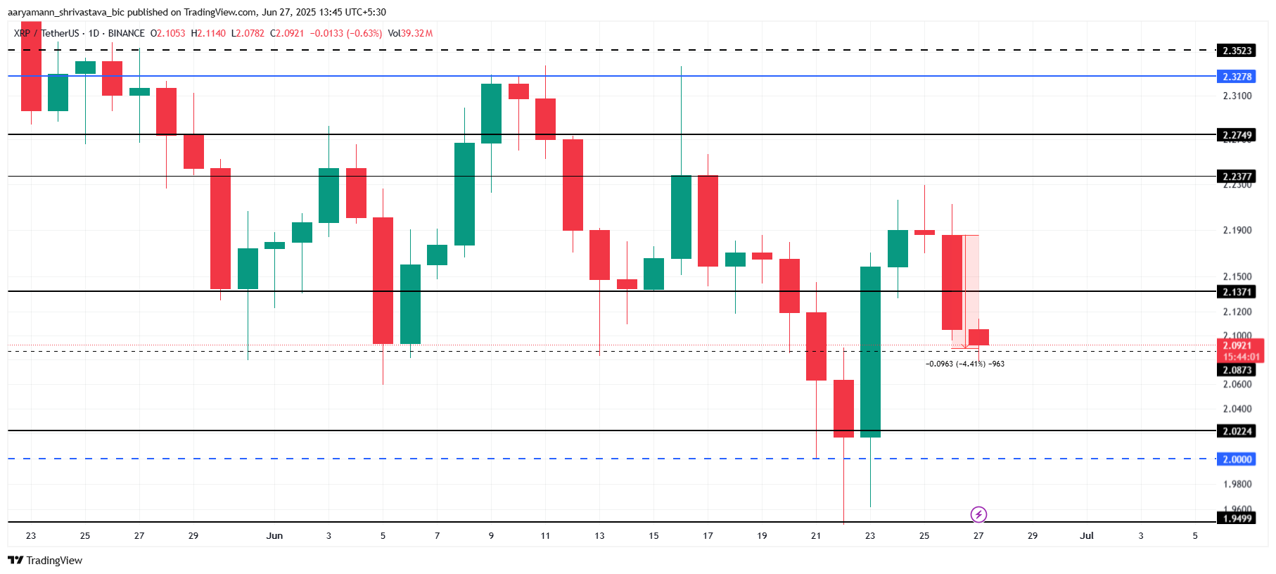 XRP бағасы 2,00 доллар шамасында ауытқып тұр, альткоин жазу кезінде 2,08 доллардан жоғары деңгейде тұр. Алайда, оның баға әрекетіндегі құбылмалылықтың артуы оны дағдарыстық 2 доллар деңгейінен төмен түсіп кетуі мүмкін деген алаңдаушылық тудырады.