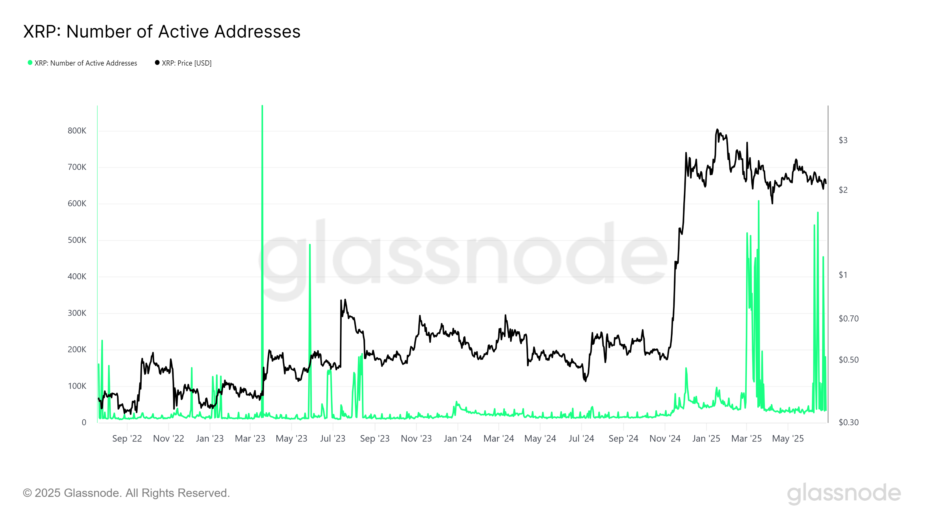 XRP жақында белсенді мекенжайлардың айтарлықтай өсуін байқады, бұл құбылмалылықтың жоғарылағанын көрсетеді. Тарихи тұрғыдан алғанда, белсенді мекенжайлардың көбеюі айтарлықтай баға қозғалыстарымен байланысты. Белсенді мекенжайлардың саны өскен сайын, XRP-дің баға әрекеті болжап болмайтын болып, кез келген бағытта күрт қозғалу ықтималдығын арттырады.
