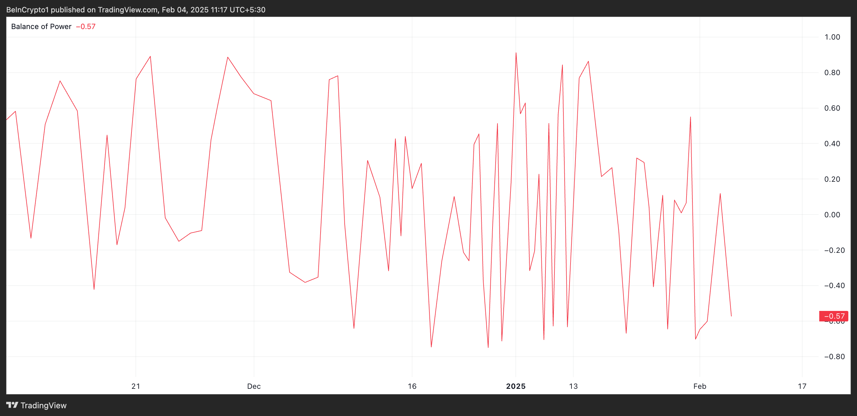 BoP индикаторы белгілі бір кезеңдегі баға қозғалыстарын талдау арқылы сатып алушылар мен сатушылардың күшін өлшейді. XRP сияқты, BoP теріс болғанда, бұл сатылым қысымының басым екенін көрсетеді, бұл аюлық трендті және трендтің кері қайту ықтималдығын арттырады.