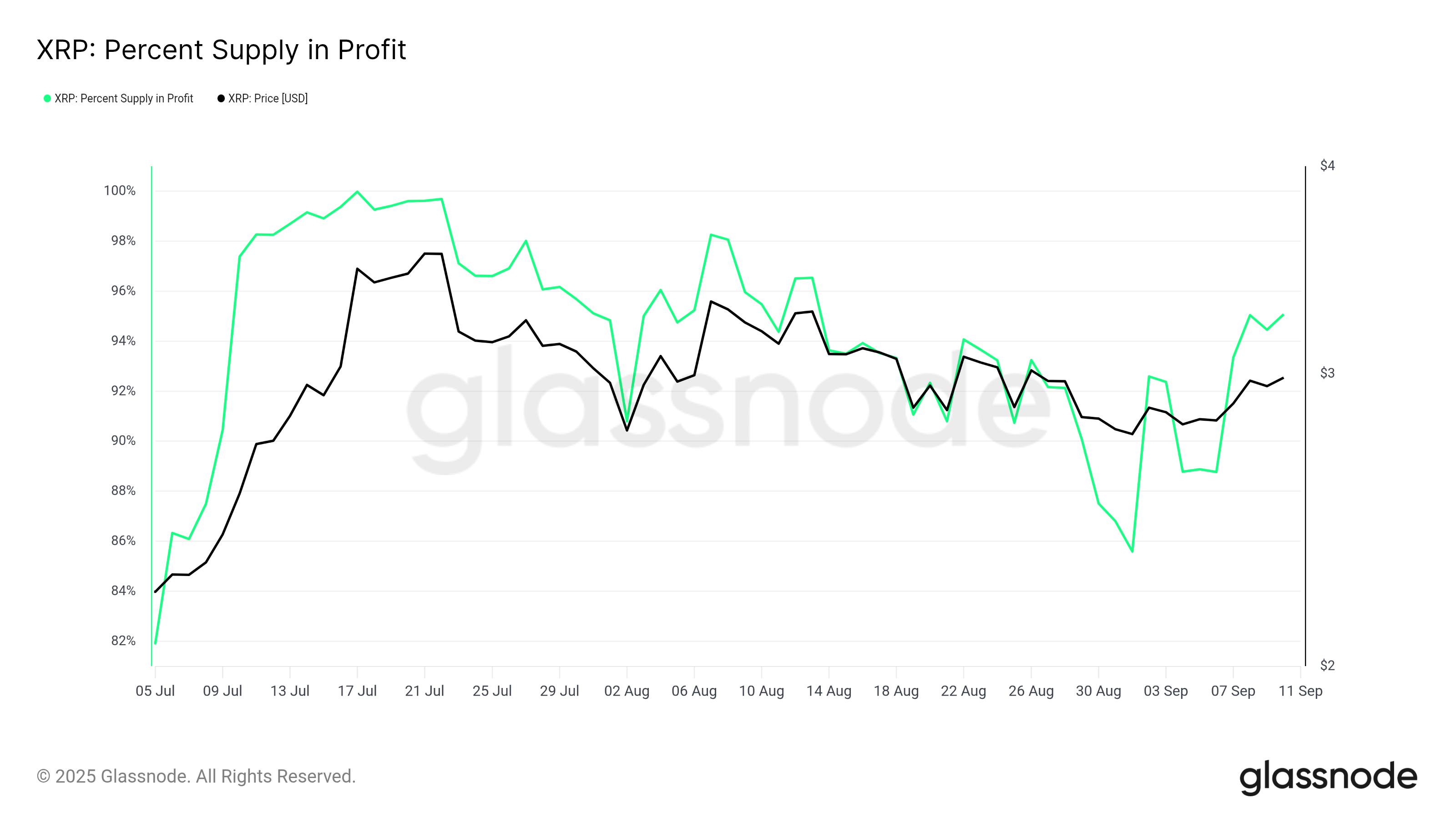 XRP үшін пайдадағы ұсыныс 95%-ға дейін өсті, бұл нарық шыңдары үшін тарихи танылған шекке жақындады. Токендердің осындай жоғары пайызы пайдада болған кезде, инвесторлар қолайлы жағдайларды пайдаланып, пайдасын қамтамасыз ету үшін жиі сатылым қысымын тудырады.