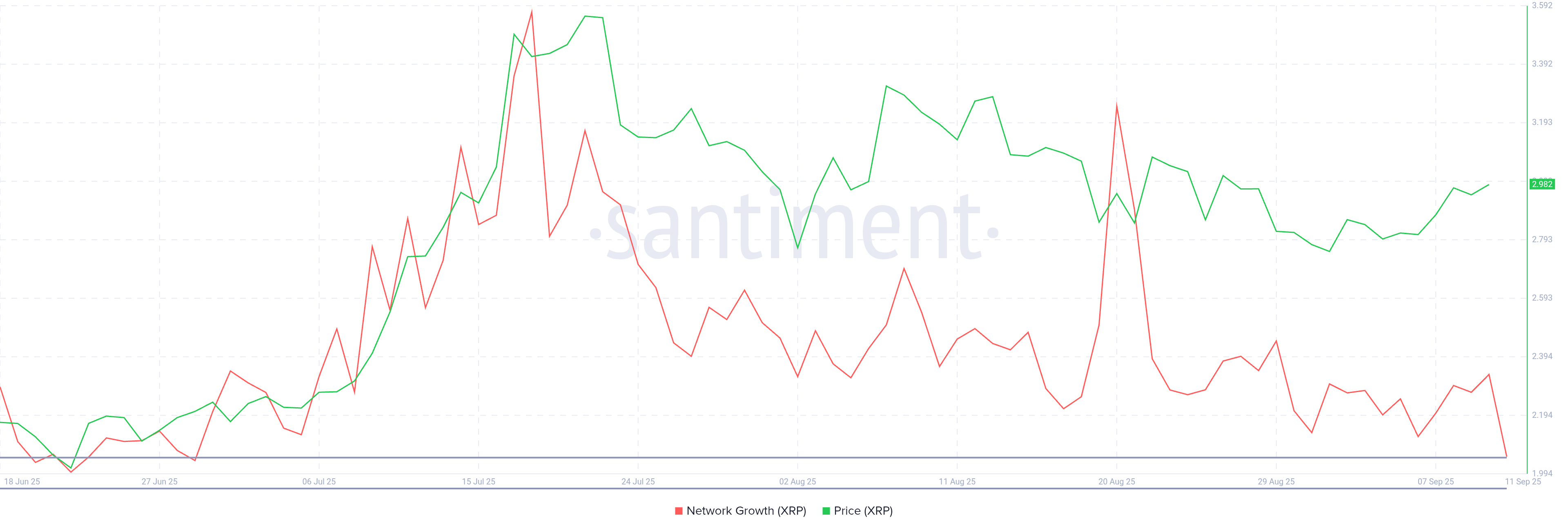 XRP желісінің өсуі алты аптадағы ең төменгі деңгейге дейін төмендеп, жаңа инвесторлардың қатысуының баяулауын көрсетеді. Бұл метрика желіге қосылатын жаңа мекенжайлардың санын көрсетеді, ұзақ мерзімді қабылдау мен капитал кірістерін бағалау үшін маңызды көрсеткіш. Соңғы баға өсуіне қарамастан, төмендеу импульстің әлсірегенін көрсетеді.