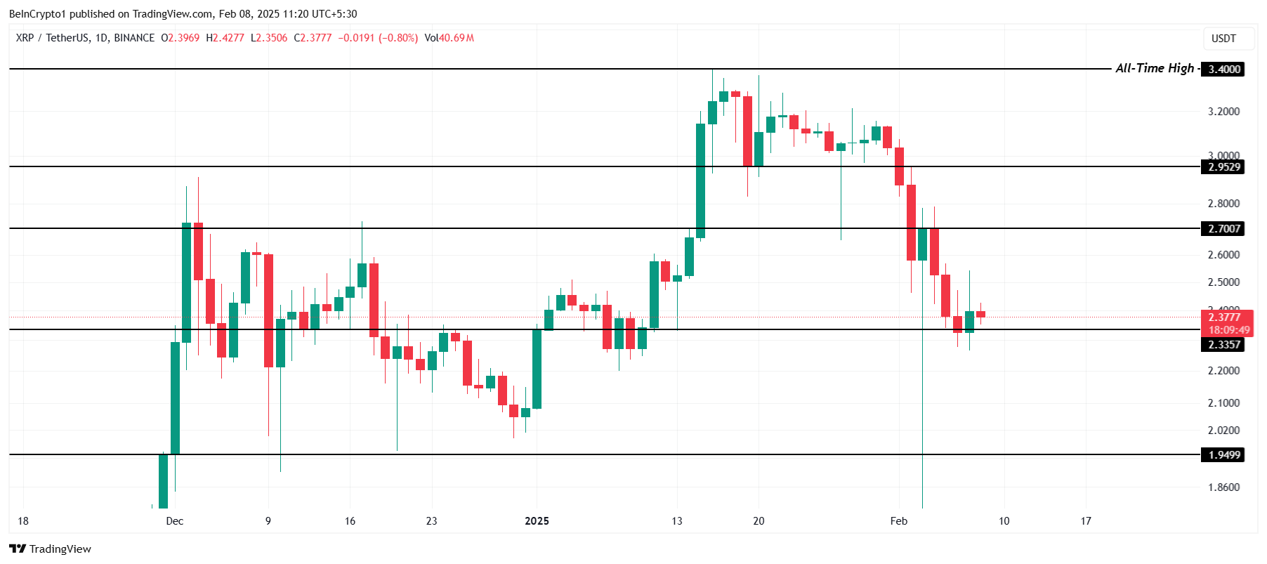 XRP қазіргі уақытта 2,37 долларда саудалануда, 2,33 доллар дағдарыстық қолдау деңгейінен жоғары тұр. Криптовалюта айдың басынан бері тұрақты төмендеуде.