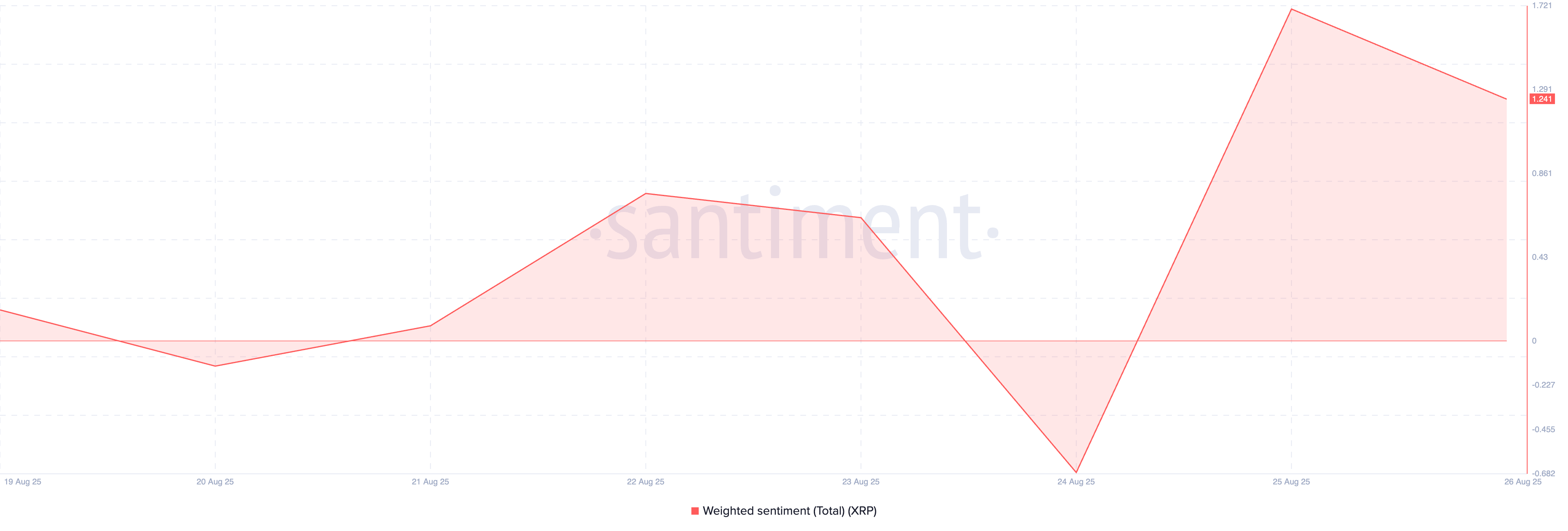 Сонымен қатар, XRP нарықта оң салмақталған көңіл-күйдің өсуін байқады, бұл жоғарыда айтылған бұқа көзқарасын растайды. Santiment мәліметтері бойынша, бұл баспасөз уақытында 1,24 деңгейінде тұр.