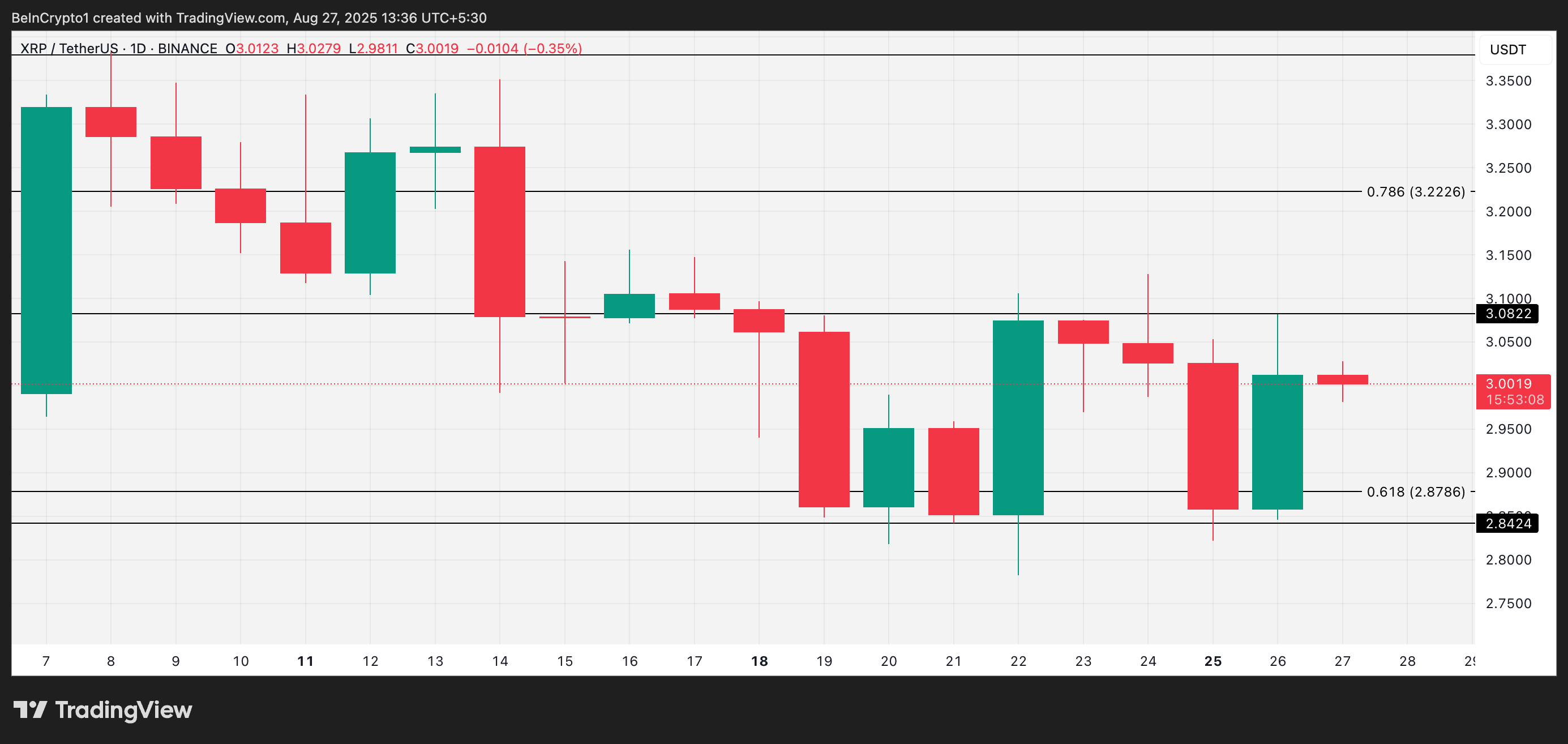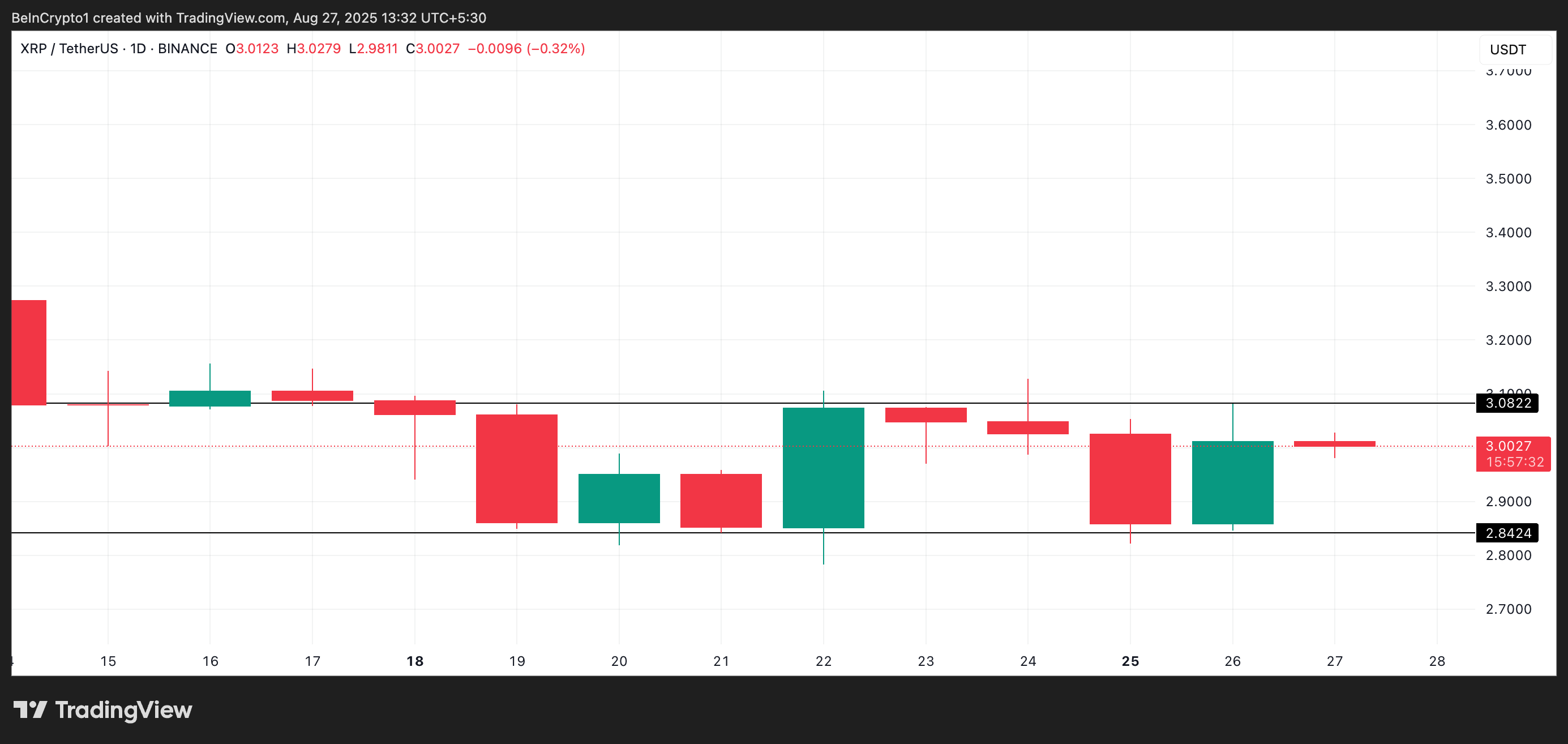 19 тамыздан бері XRP 3,08 доллардағы қарсылықтан жоғары көтеріле алмай, 2,84 доллардағы қолдауды сақтап келеді. Бұл диапазондық қозғалыс кез келген бағытта әлсіз импульсті көрсетіп, трейдерлерді шешуші серпілісті күтуге мәжбүр етеді.