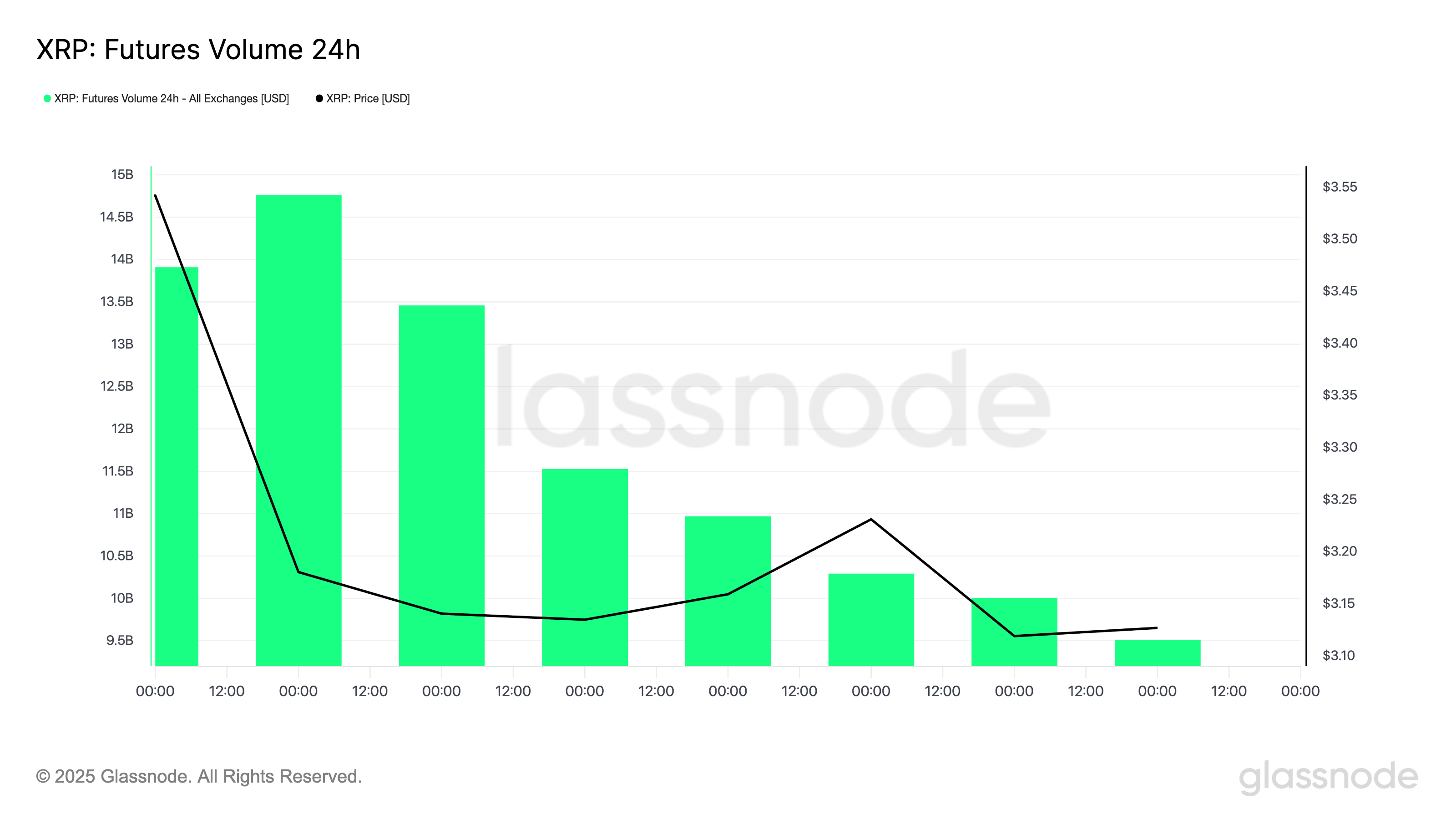 Сонымен қатар, фьючерстер нарығындағы белсенділік айтарлықтай төмендеді, бұл импульстің жоғалуын одан әрі көрсетеді. Glassnode мәліметтері бойынша, жеті күндік орташа мәнді пайдалана отырып өлшенген XRP фьючерстер келісімшарттарының жалпы күнделікті көлемі өткен аптада 30%-дан астамға төмендеді.