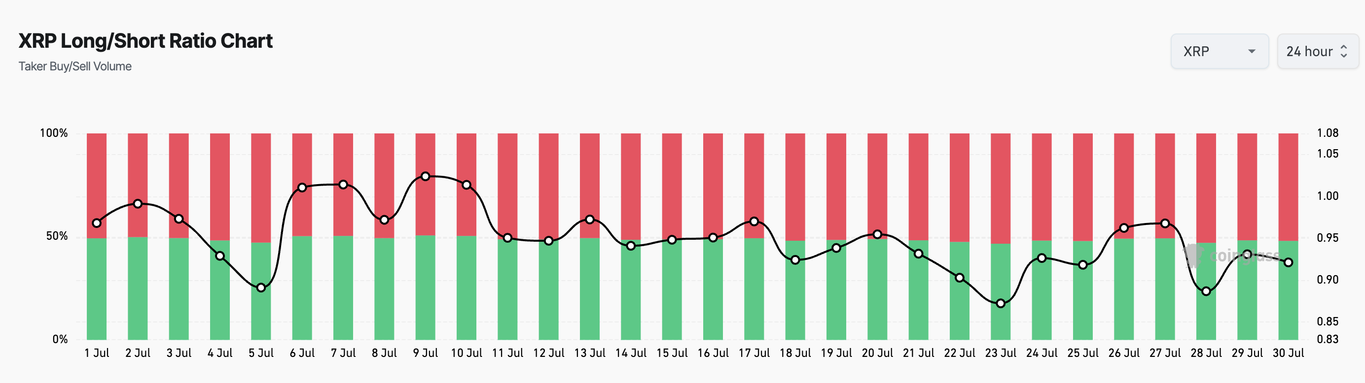Өкінішке орай, XRP-ді жоғары итермелеу ниеті оның фьючерстер нарығында басым көңіл-күй емес. Бұл оның ұзақ/қысқа қатынасымен көрінеді, ол қазір 0,92 деңгейінде.