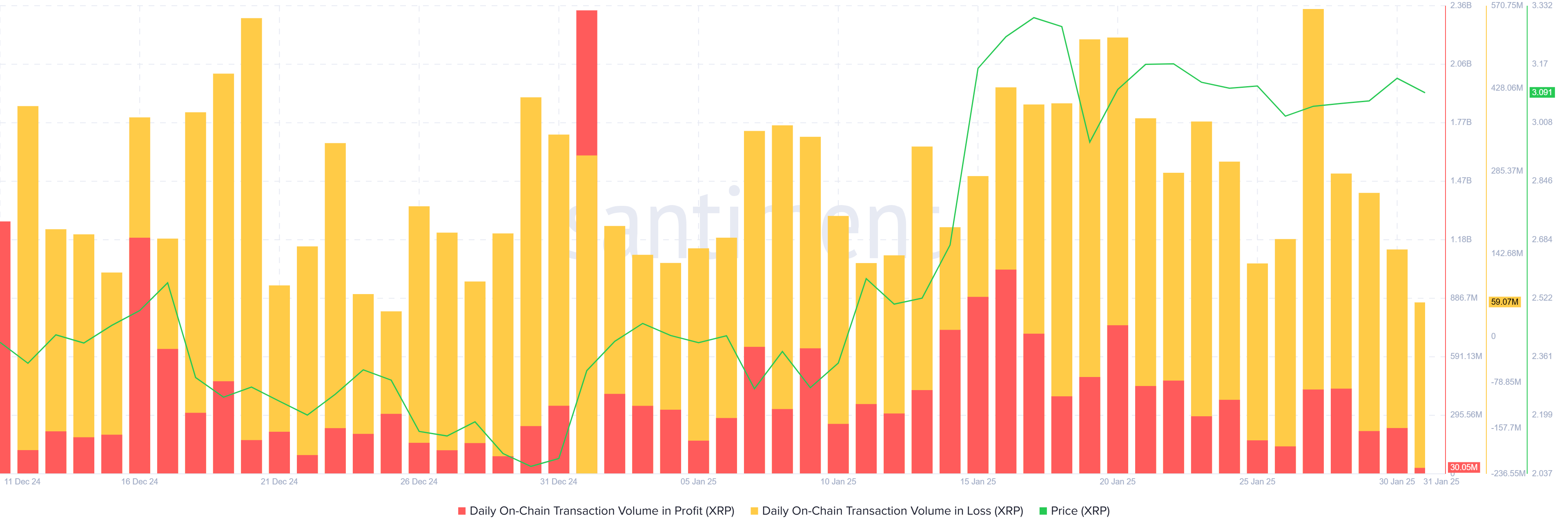 XRP транзакция көлемі негізінен шығындармен басым болды. Жаңа ATH қол жетімсіз болып қалғанда, инвесторлар өз активтерін жылжыта бастады. Бұл үрдіс соңғы екі аптада көптеген XRP иелерінің транзакцияларында шығынға ұшырауына әкеліп, жалпы нарық сеніміне әсер етті.