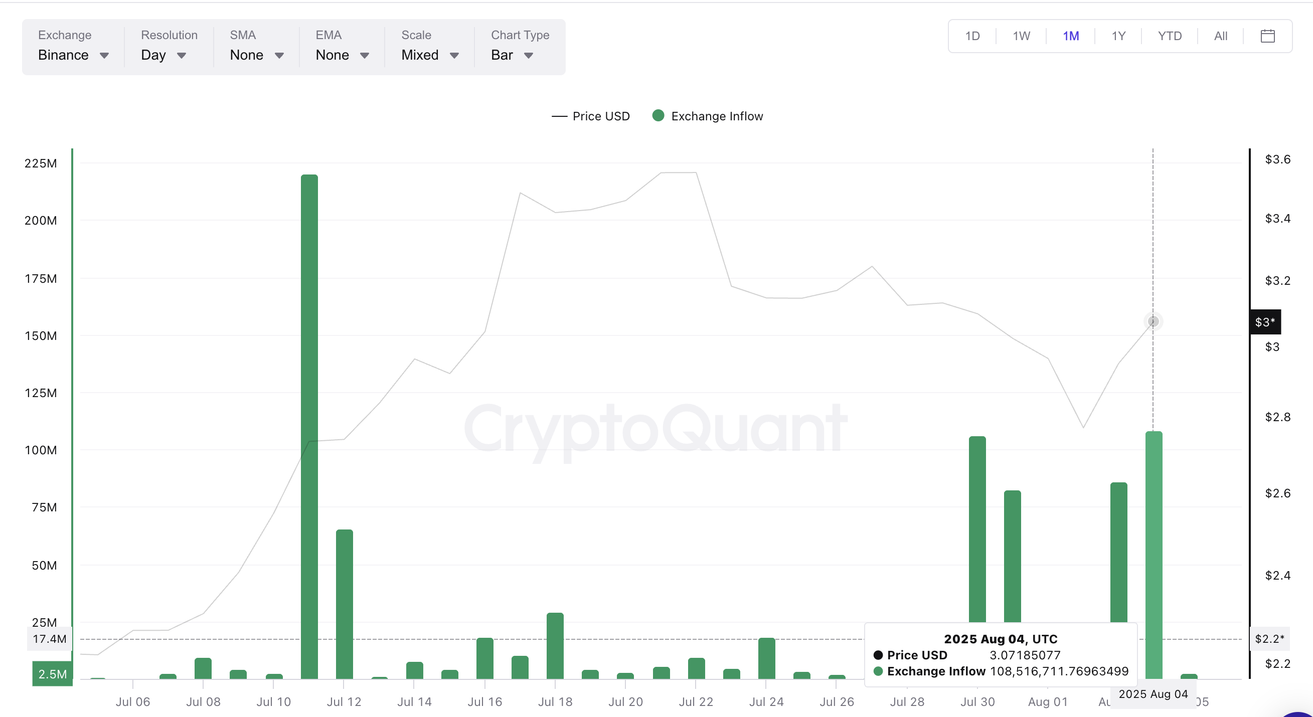 Қызықтысы, киттер де бұл қозғалысты жүргізуде рөл атқаруы мүмкін. Киттен-биржаға ағындар деректері ірі иелердің өткен раллилер кезінде агрессивті түрде сатқанын көрсетеді. 30 шілдеде кит кірістері 55 000 XRP-дан асып, ай ішіндегі ең жоғары деңгейге жетті, XRP бағасы 3,00 доллардан төмен түскен кезде. Тағы да, 3 тамызда кірістер 38 226 XRP-ға жетті, баға 3,00 долларға жақындаған кезде.