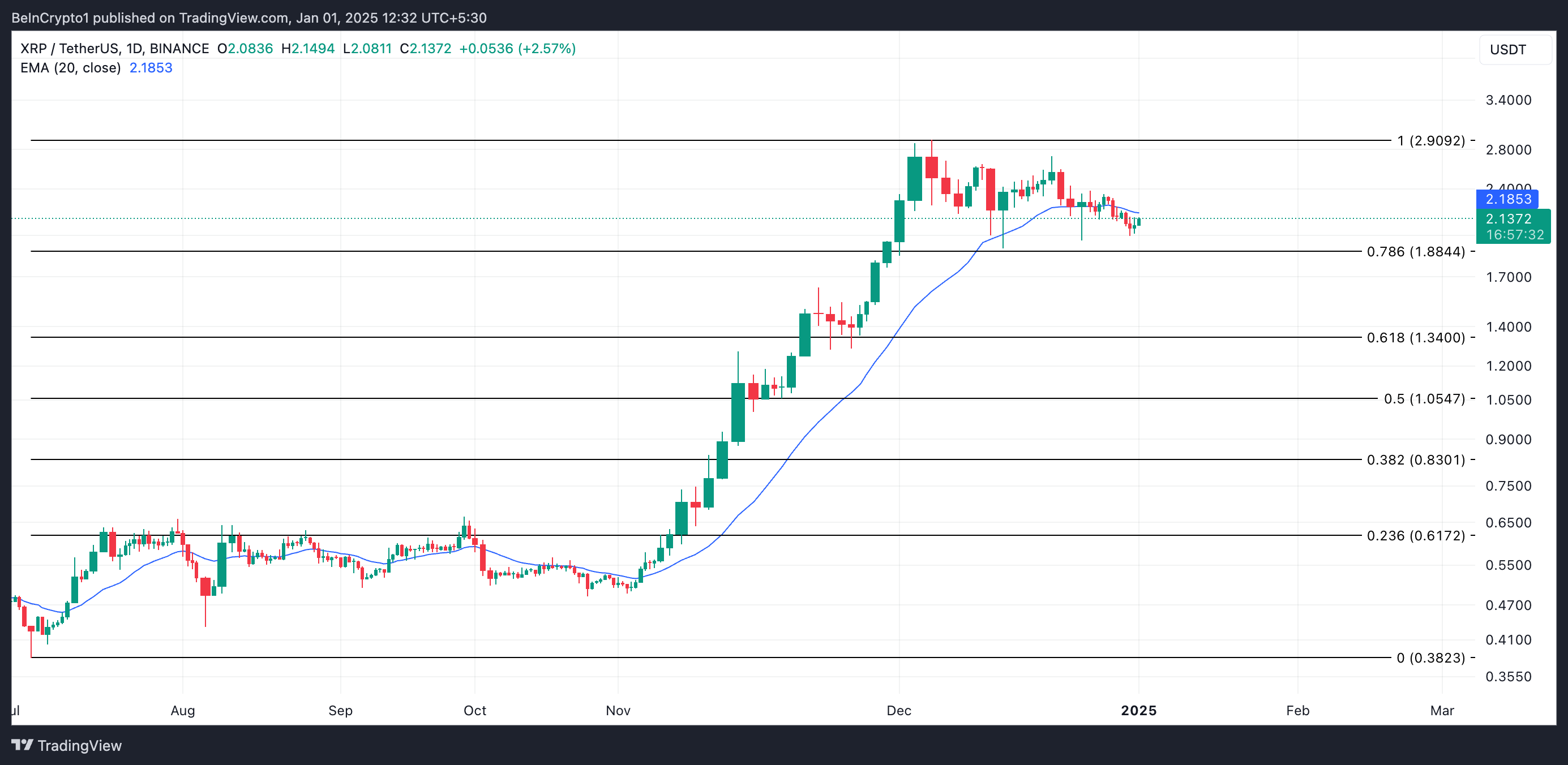Күнделікті диаграммада XRP қазіргі уақытта өзінің 20-күндік экспоненциалды қозғалмалы орташа мәнінен (EMA) төмен саудаланады, ол активтің соңғы 20 күндегі орташа бағасын есептейді, қысқа мерзімді трендтерді жақсырақ түсіру үшін соңғы бағаларға көбірек салмақ береді.