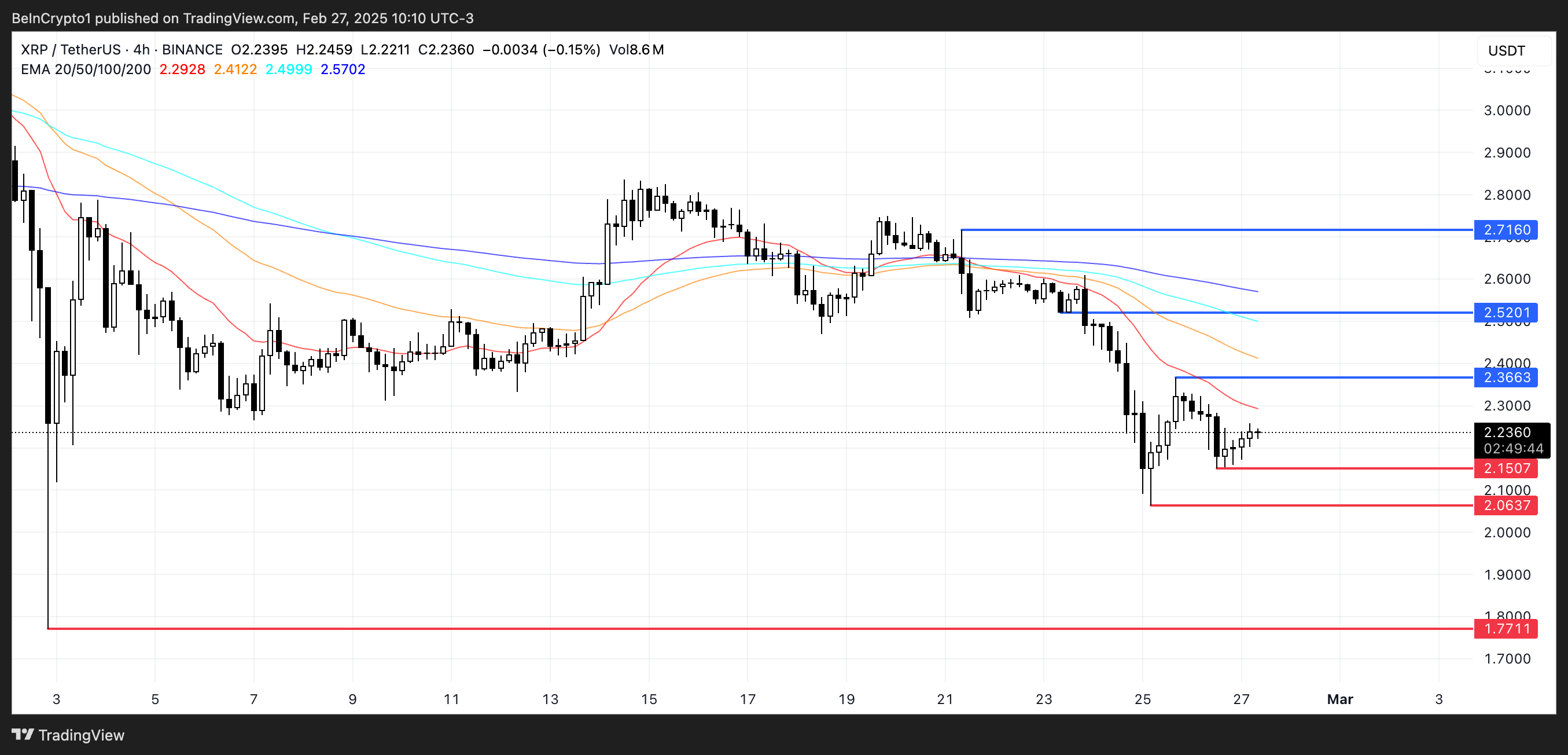 XRP-дің EMA сызықтары қазіргі уақытта қысқа мерзімді сызықтар ұзақ мерзімді сызықтардың астында орналасқан аюлық орнатуды көрсетеді. Баға 1 ақпаннан бері 3 доллардан төмен саудалануда.