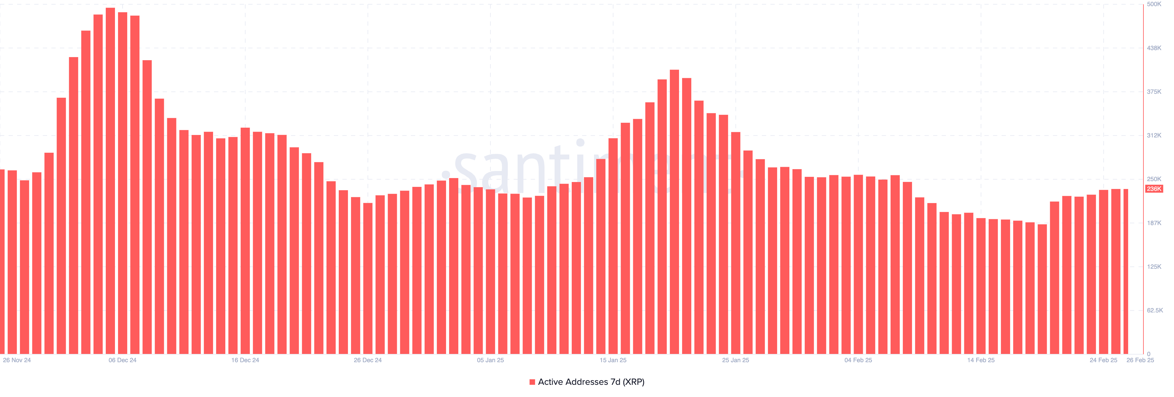 Жақында XRP белсенді мекенжайлары қалпына келе бастады, соңғы аптада 26,8%-ға өсіп, 236 000-ға жетті. Бұл өсу желідегі пайдаланушылар белсенділігінің артуын және жаңартылған қызығушылықты көрсетеді.