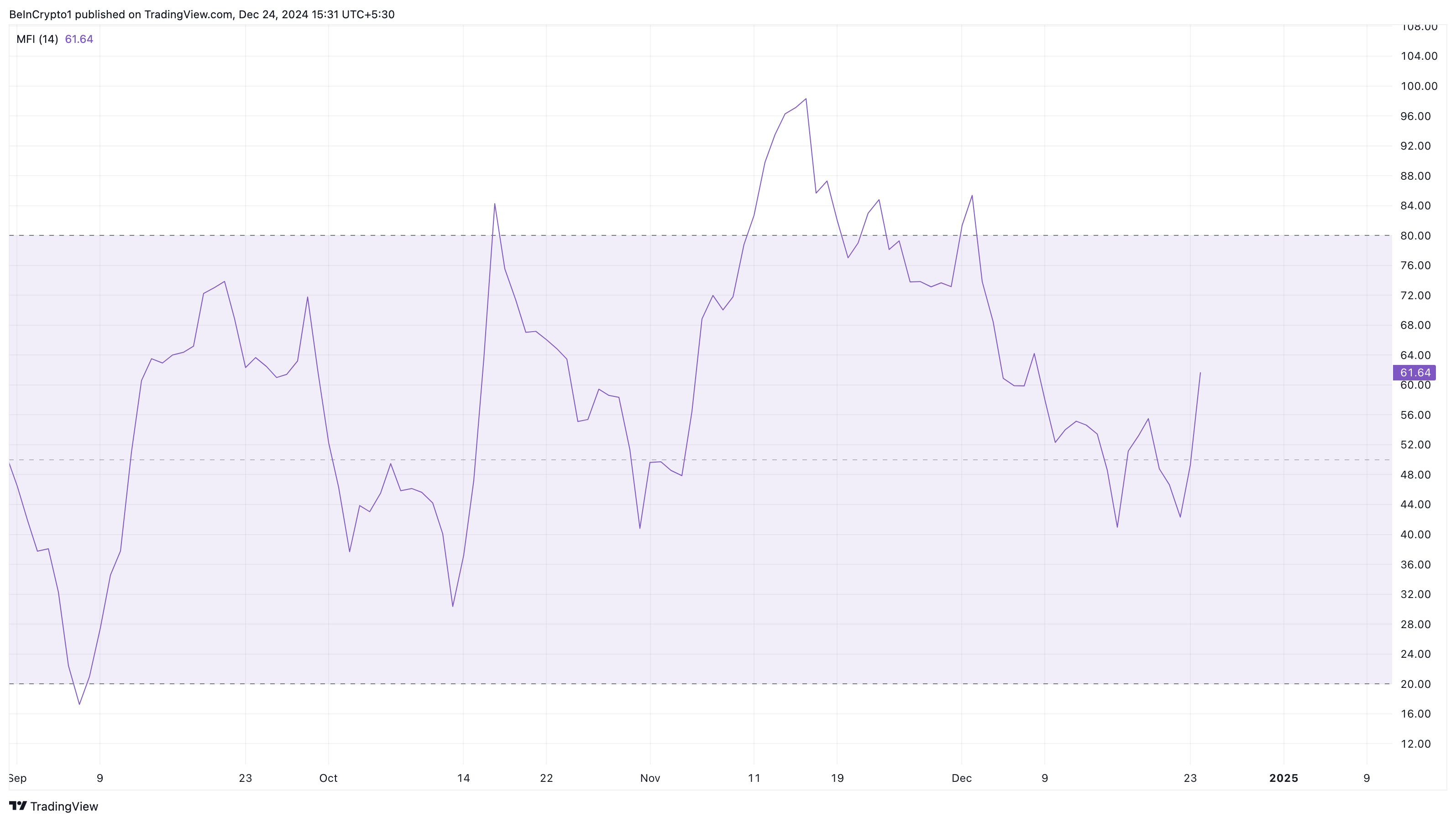 Бұл болжамды қолдайтын тағы бір көрсеткіш – Ақша Ағыны Индексі (MFI). MFI криптовалютаның бағасы мен көлемін талдау арқылы сатып алу және сату қысымын өлшейді.