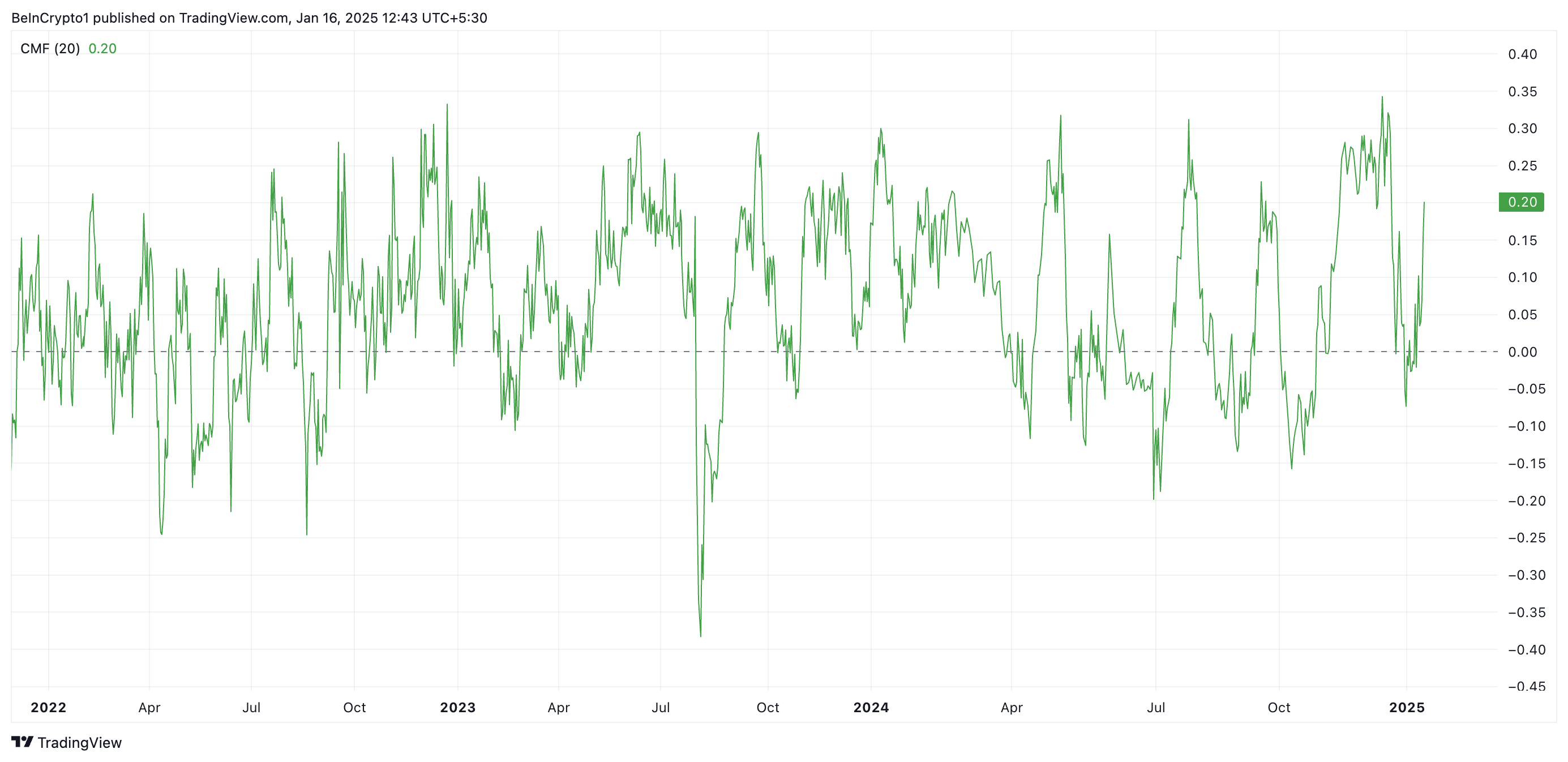 Бұл XRP-дің Чайкин ақша ағынының (CMF) өсуімен дәлелденеді. Бұл жазу кезінде, бұл импульс индикаторы 0,20 деңгейінде жоғары бағытта.