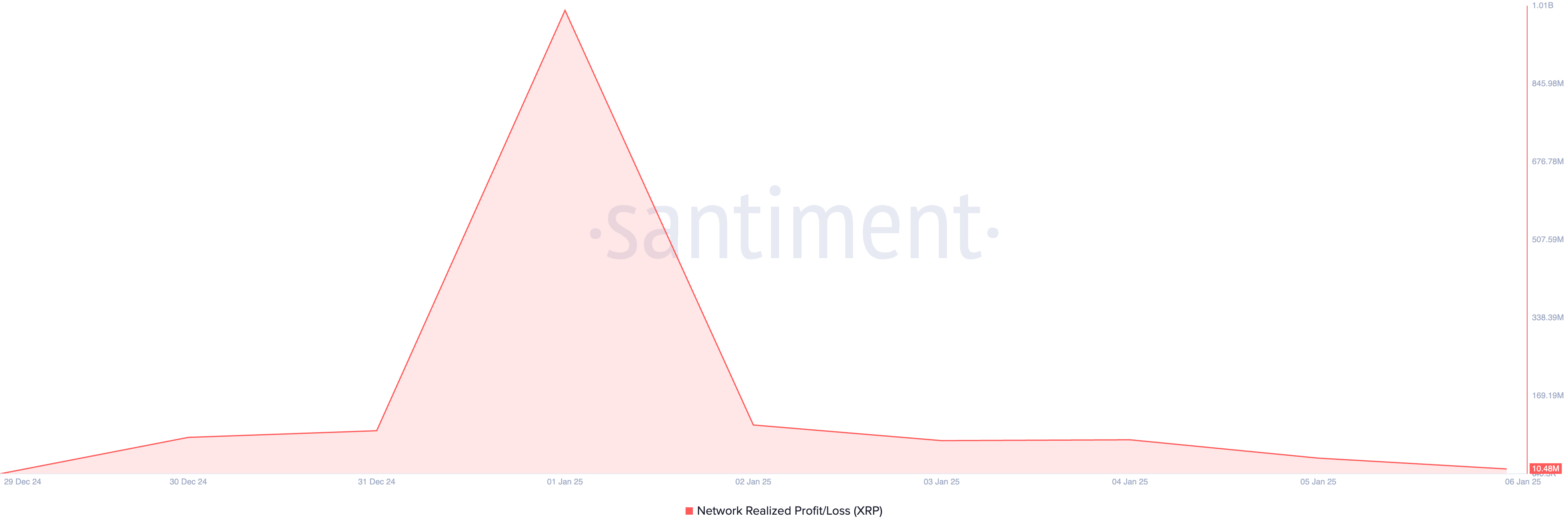 Сонымен қатар, XRP желісінің жүзеге асырылған пайда/шығын көрсеткішінің төмендеуі бұл аюлы көзқарасты қолдайды. Santiment мәліметтері бойынша, 1 қаңтарда 1 миллиард долларға жеткеннен бері, көрсеткіштің мәні 99% төмендеді. Басылым уақытында бұл 10,48 миллион долларды құрайды.
