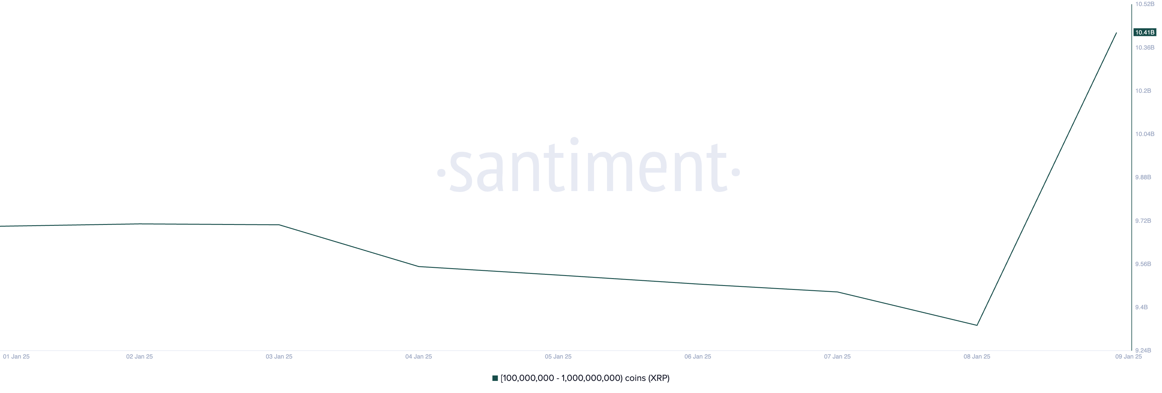 Santiment мәліметтері бойынша, 100,000,000 мен 1,000,000,000 XRP арасында ұстайтын кит мекенжайлары бүгін 3 миллиард долларға бағаланған 1,08 миллиард токенді бірлесіп сатып алды. Бұл топтың жалпы иеліктерін 2024 жылдың маусымынан бергі ең жоғары деңгейге, яғни 10,41 миллиард XRP-ге жеткізді.
