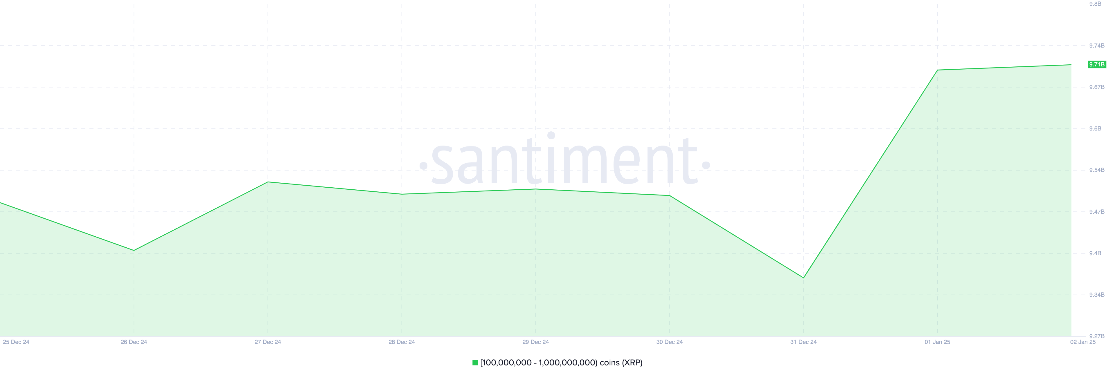 BeInCrypto зерттеулеріне сәйкес, бұл бағаның өсуі маңызды XRP жинақталуымен байланысты болуы мүмкін. Santiment деректері 100 миллионнан 1 миллиардқа дейін XRP ұстайтын мекенжайлар сейсенбіде 9.36 миллиардтан бүгінгі күні 9.71 миллиардқа дейін жалпы балансын арттырғанын көрсетеді — бұл 350 миллион токенді $826 миллионға сатып алу.