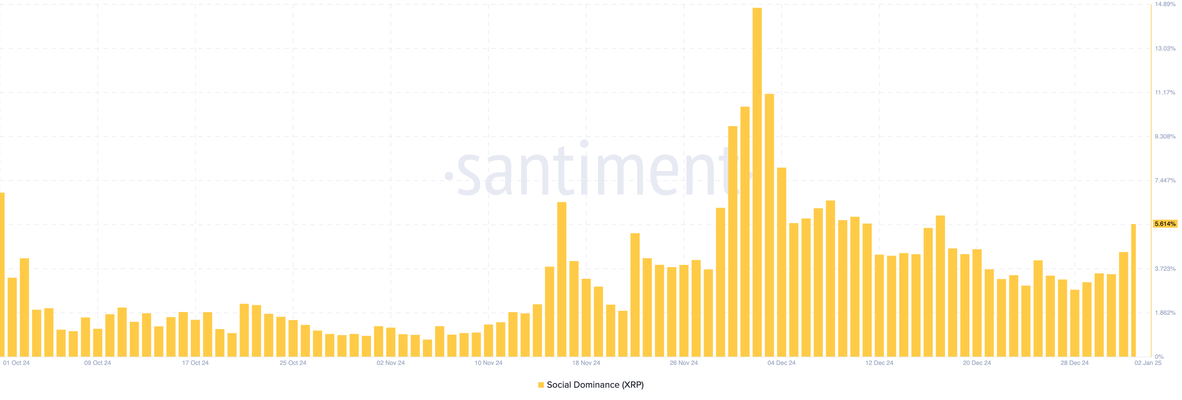 Баспасөз уақытында, XRP-ның әлеуметтік үстемдігі 5.61%-ға дейін өсті, бұл токенге сұраныс қазіргі уақытта алып отырған назарын сақтаса, артуы мүмкін екенін көрсетеді. Егер солай болса, XRP бағасы осы жылдың алғашқы айын $3-тан жоғары бастау ықтималдығы бар.