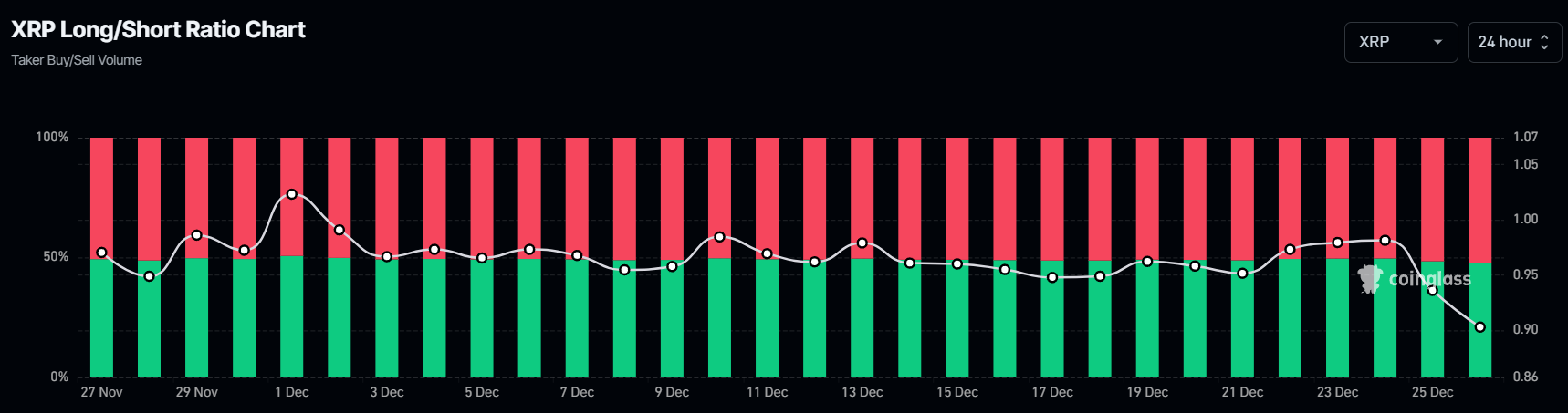 Трейдерлер көбінесе XRP-ті қысқартуға бейімделіп, көтерілуді күткеннен гөрі. Ұзын/қысқа қатынасы қазіргі уақытта қысқа келісімшарттардың ұзын келісімшарттарды басып озғанын көрсетеді, бұл айлық төмендікті көрсетеді. Бұл теңгерімсіздік аюлы нарықтық көңіл-күйді көрсетеді, инвесторлар XRP бағасының көтерілуінен гөрі төмендеуін күтеді.