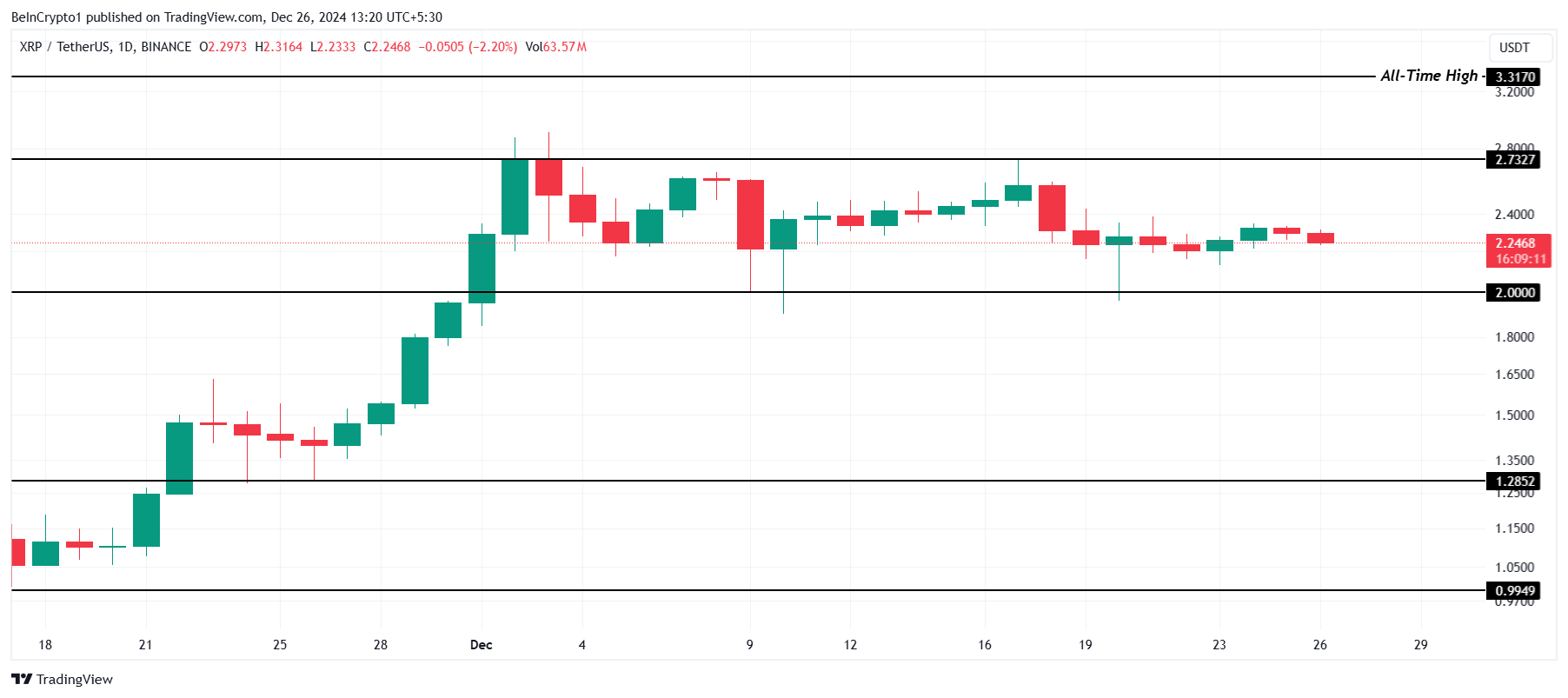 $3.31 ағымдағы ATH XRP-тің $2.24 сауда бағасынан 48% қашықтықта. XRP осы деңгейге жету үшін алдымен ағымдағы диапазоннан шығып, $2.73-ті қолдауға айналдыруы керек. Бұл қозғалыс жаңартылған бұқа қозғалысын білдіріп, әлеуетті көтерілуді бастауға мүмкіндік береді.