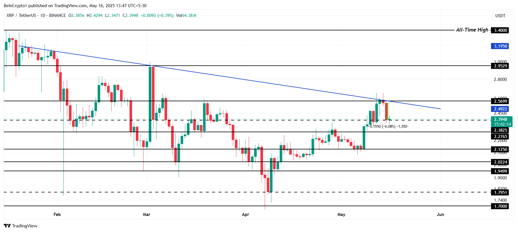 XRP соңғы 24 сағатта 6%-ға төмендеп, 2,39 долларға саудалануда. Альткоин шамамен төрт айлық төмендеу сызығының астында қалып қойды, бұл оның құлдырауын жалғастыру ықтималдығын көрсетеді. Бұл техникалық кедергі кез келген қысқа мерзімді қалпына келтіру үшін айтарлықтай қиындық тудырады.