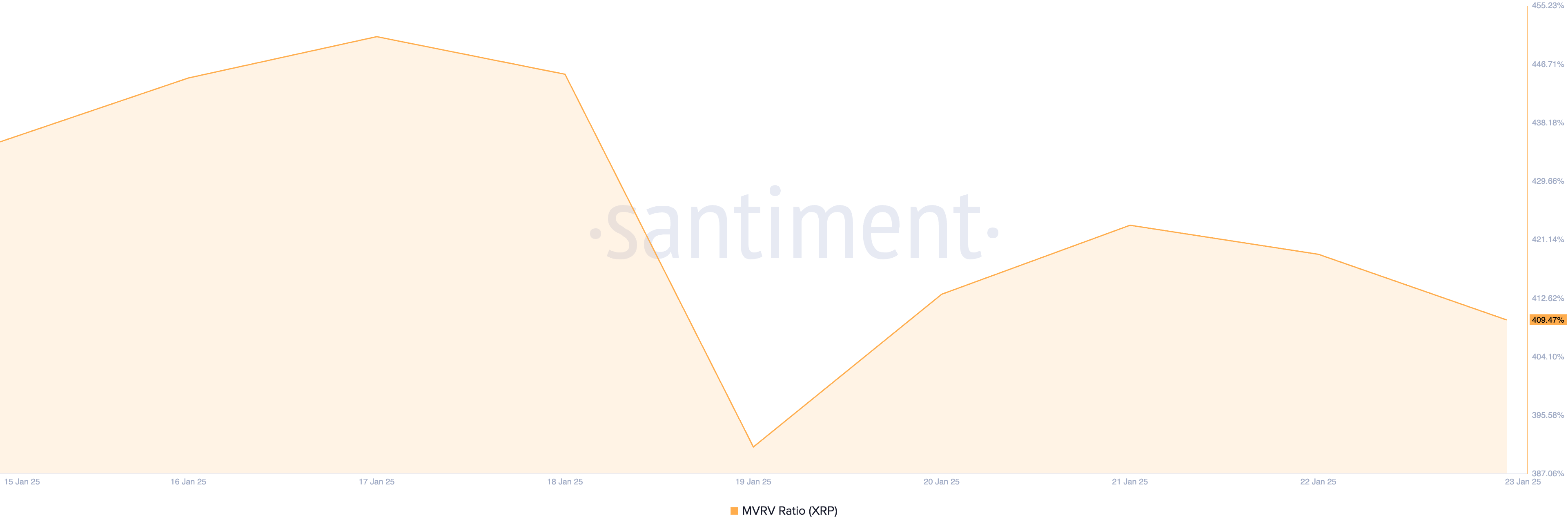 XRP-ның нарықтық құнының жүзеге асырылған құнына (MVRV) қатынасы оның артық бағаланған күйін көрсетеді, Santiment деректеріне сәйкес, басылым уақытында 409,47% деңгейінде тұр.