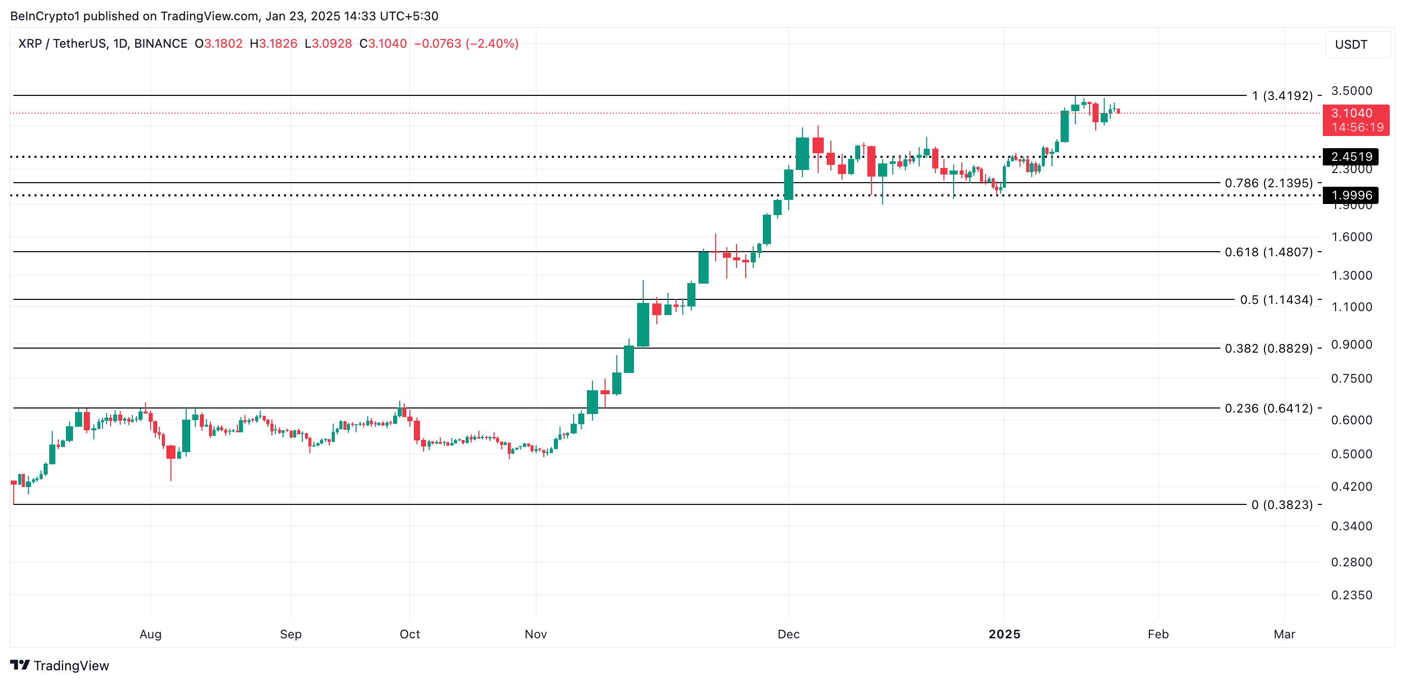Сату белсенділігі күшейген сайын, XRP бағасы барлық уақыттағы ең жоғары бағасынан әрі қарай төмендейді. Оның Фибоначчи кері қайтару құралының көрсеткіштеріне сәйкес, альткоин бағасы 2,45 доллар қолдау деңгейіне дейін төмендеуі мүмкін.