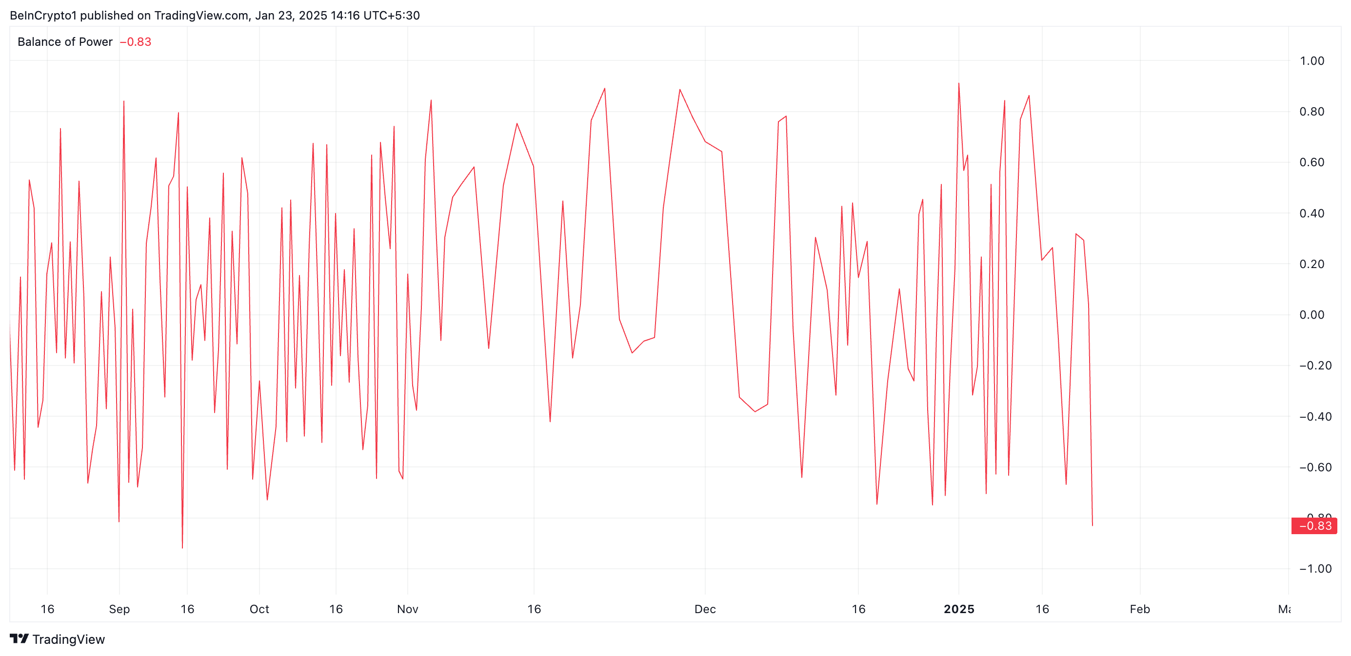 BoP нарықтағы сатып алу мен сату қысымының салыстырмалы күшін өлшейді. BoP теріс болғанда, бұл сату қысымы сатып алудан басым екенін көрсетеді. Бұл көбірек инвесторлардың өз позицияларын жоюға тырысатынын, жинақтауға емес, бұл бағаның төмендеуіне әкелуі мүмкін екенін білдіреді.