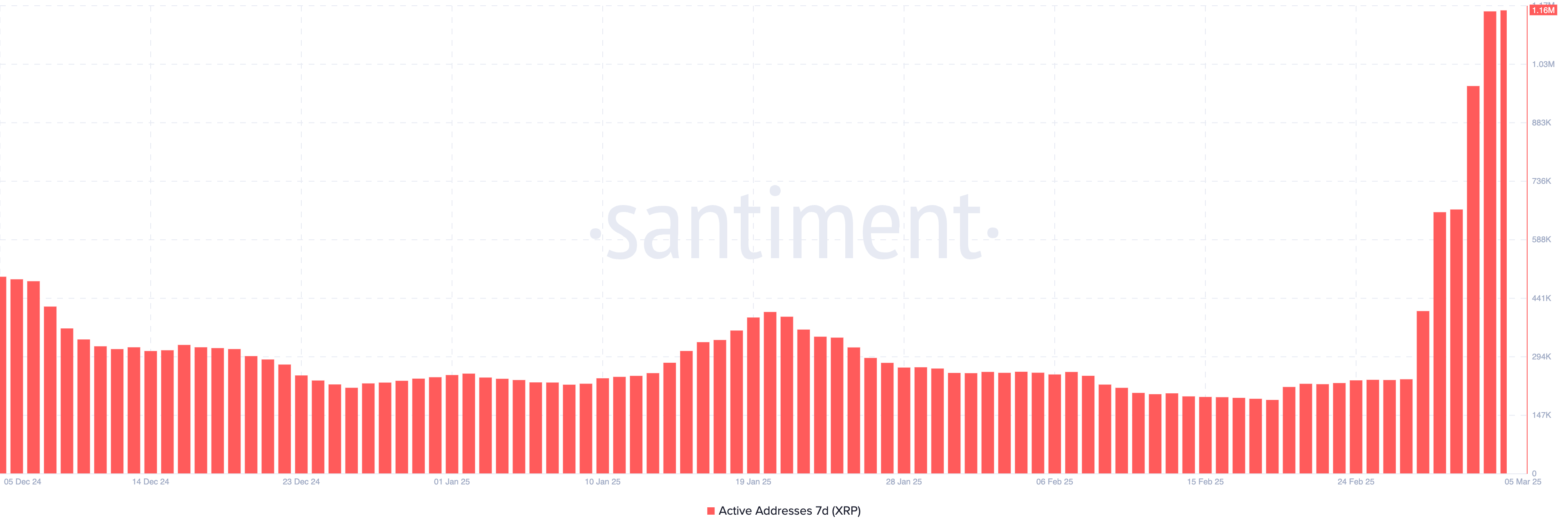 XRP-дің 7 күндік белсенді мекенжайлары 1,16 млн-ға дейін өсті, бұл олардың ең жоғары деңгейі.