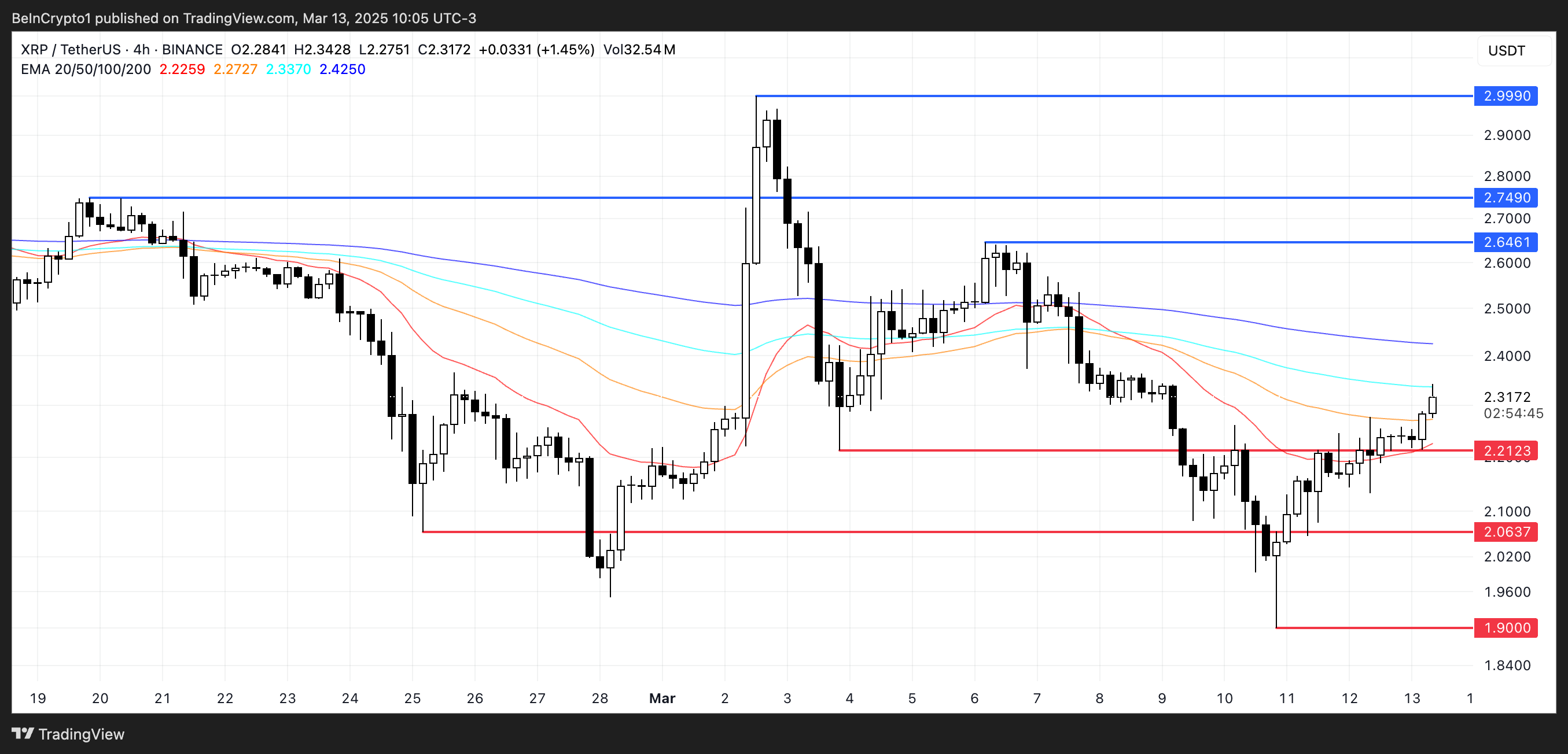 XRP-нің EMA сызықтары әлі де аюлы формада, қысқа мерзімді EMA-лар ұзақ мерзімділерден төмен орналасқан.