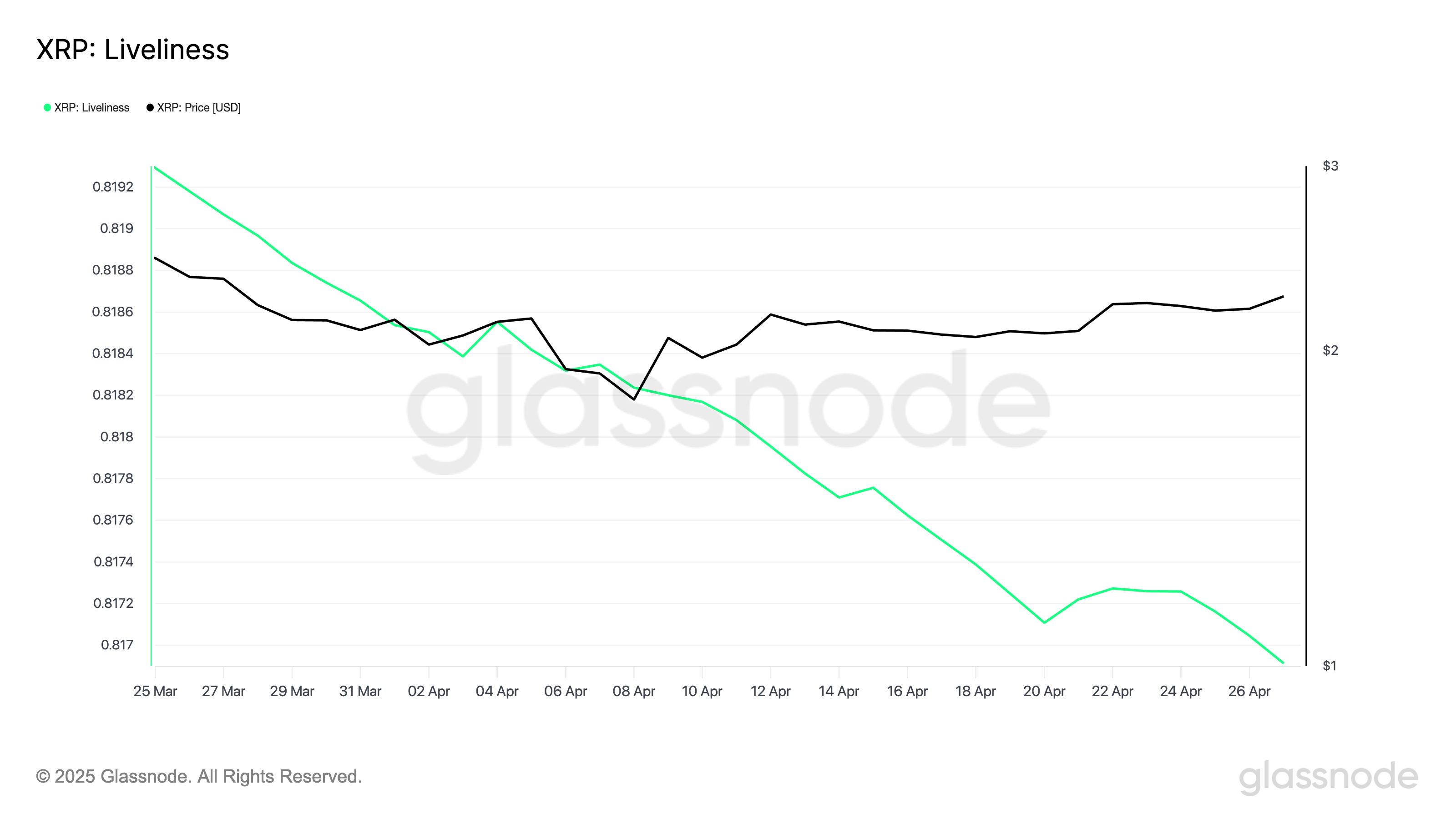 Сонымен қатар, XRP LTHs (токендерін 155 күннен астам уақыт ұстағандар) өткен аптада өз активтерін сатудан бас тартты. Бұл әрекеттегі өзгеріс токеннің Liveliness метрикасының төмендеуінен көрінеді, ол оның ескі монеталарының қозғалысын өлшейді.