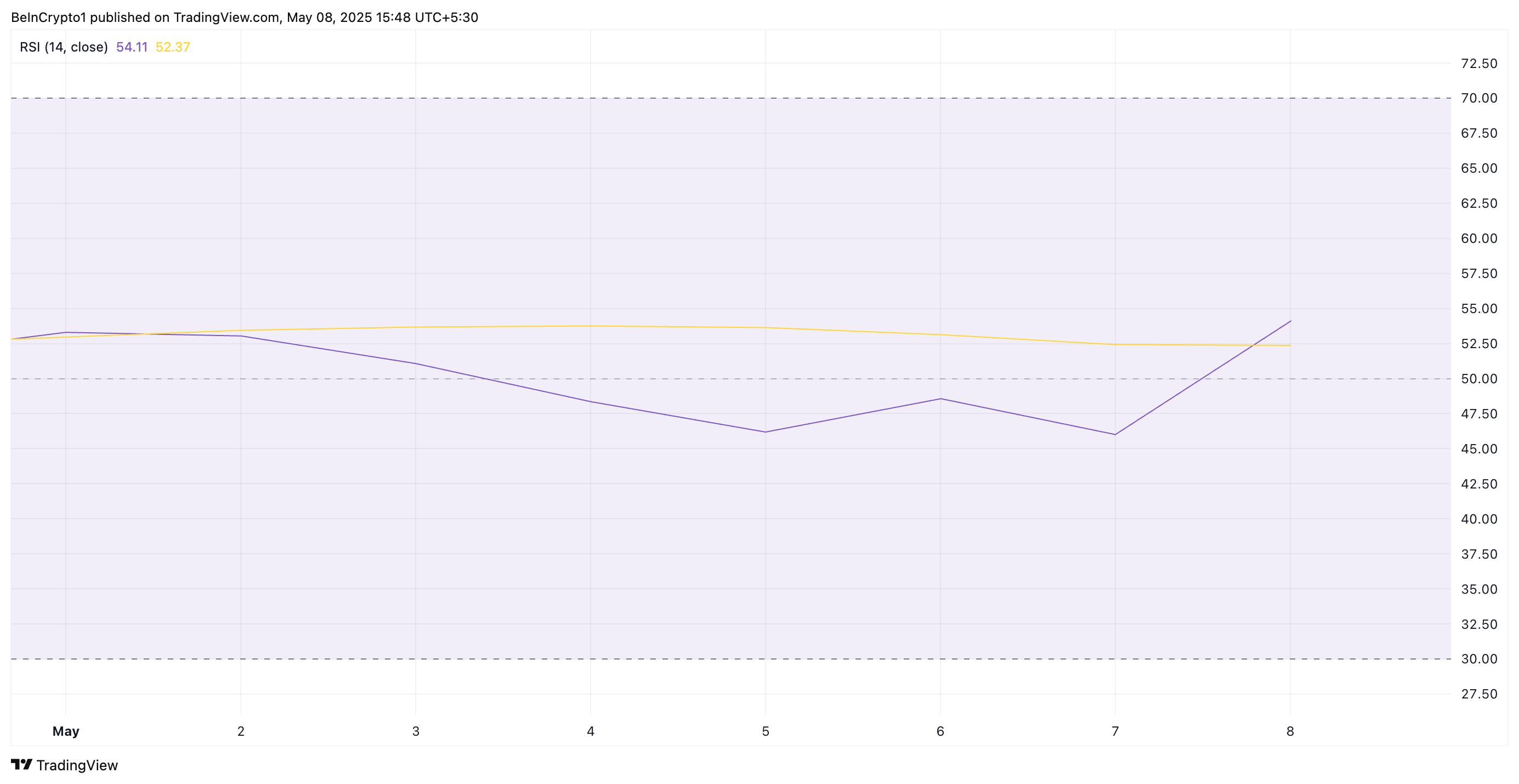 54,11 және өсіп келе жатқанда, XRP-тің RSI сатып алу қысымының күшейіп жатқанын көрсетеді. Бұл токен артық сатып алынғанға дейін одан әрі өсу ықтималдығын да меңзейді.