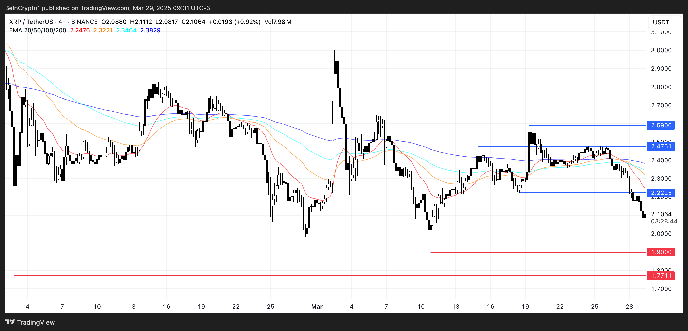 XRP-нің Экспоненциалды жылжымалы орташа (EMA) сызықтары қазіргі уақытта күшті төмендеу трендін көрсетіп тұр, қысқа мерзімді EMA-лар ұзақ мерзімділерден төмен орналасқан — бұл классикалық аюлық орналасу.