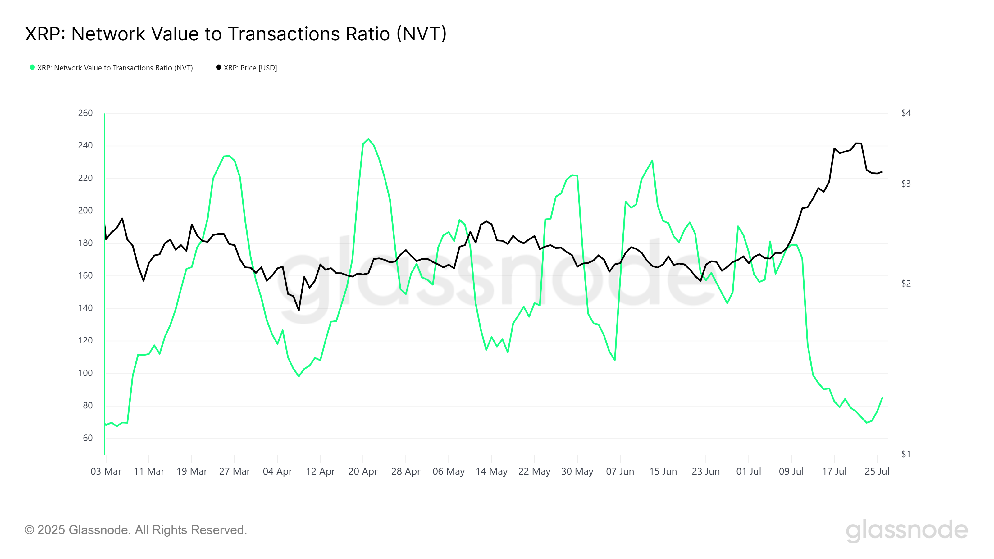 Криптовалюта бағалауларын бағалаудың маңызды көрсеткіші болып табылатын NVT қатынасы төрт айлық ең төменгі деңгейде. Бұл XRP-дің қызып кетпегенін және өсуге мүмкіндігі бар екенін көрсетеді. Төмен NVT қатынасы альткоиннің ағымдағы бағасы оның желілік белсенділігімен негізделгенін көрсетеді, бұл шамадан тыс алыпсатарлықсыз бағаның өсуін ықтимал етеді.