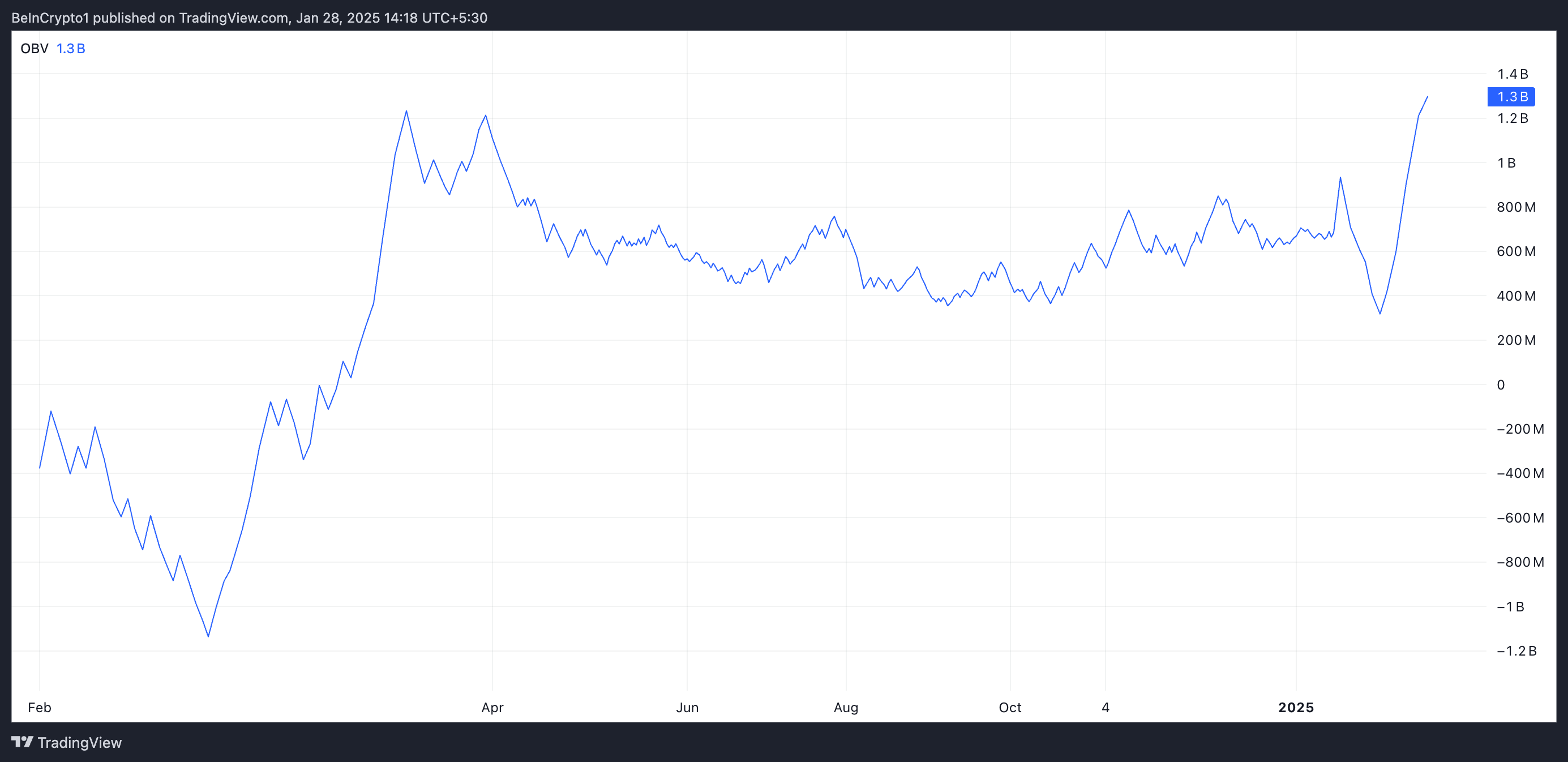 Активтің OBV-і ақша ағынын бағалап, баға қозғалысын болжайды. Ол осылай көтерілгенде, сатып алу қысымының артуын көрсетеді, өйткені үлкен көлем жоғары баға қозғалысымен байланысты, бұл әлеуетті бычий трендті көрсетеді.