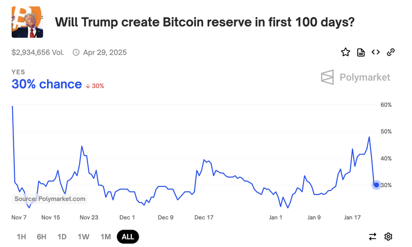 Оптимизмге қарамастан, Polymarket Президент Дональд Трамптың алғашқы 100 күнінде биткоин резервін құру мүмкіндігі инаугурациясынан кейін төмендегенін көрсетті.