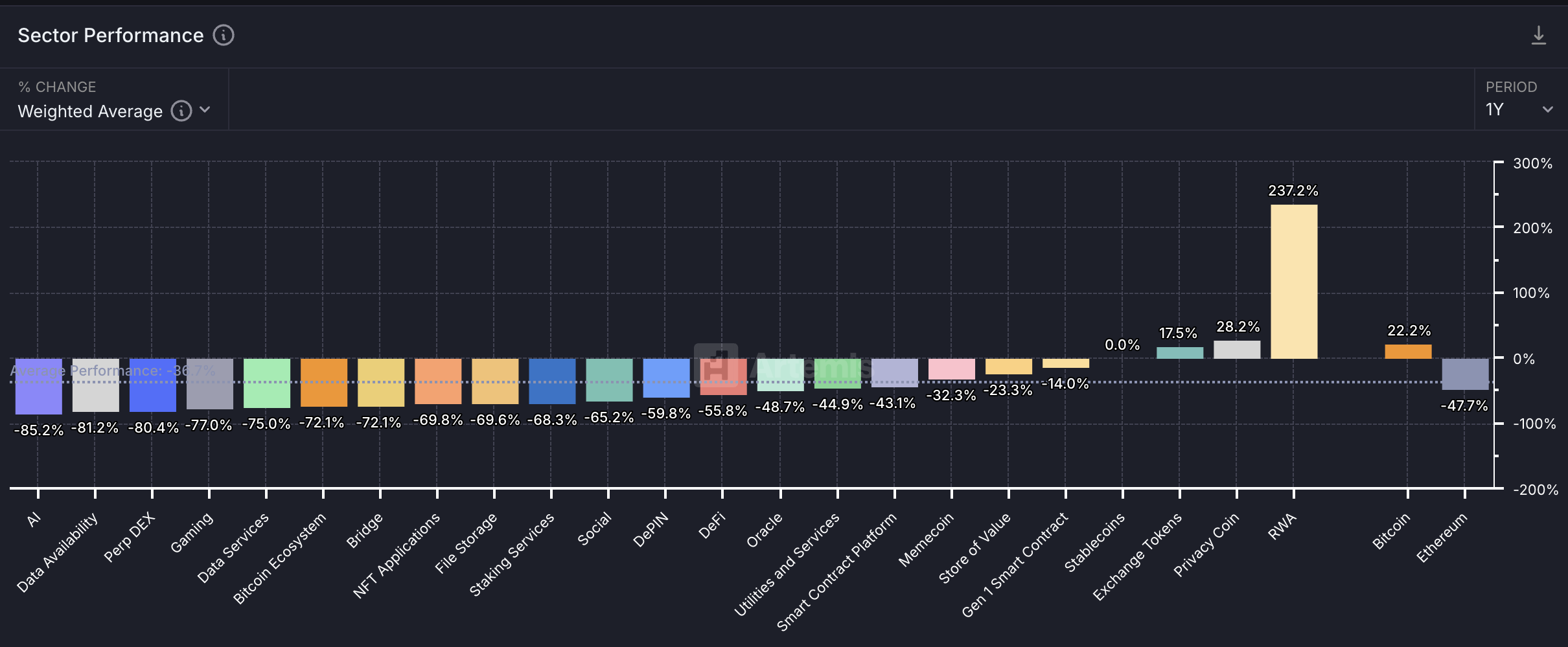 Сонымен қатар, RWA секторы өткен жылы ең жақсы көрсеткіш көрсеткен санат ретінде пайда болды, 237,2% әсерлі өсуімен.