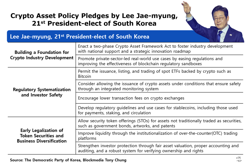 Крипто сайлауда сирек кездесетін екіжақты мәселе болды. Екі негізгі кандидат та криптоға қолдау көрсететін саясаттарды қолдады, бұл блокчейн мен цифрлық активтердің Оңтүстік Кореяның инновациялық экономикасының орталығында тұрғанын мойындаудың артып келе жатқанын білдіреді.