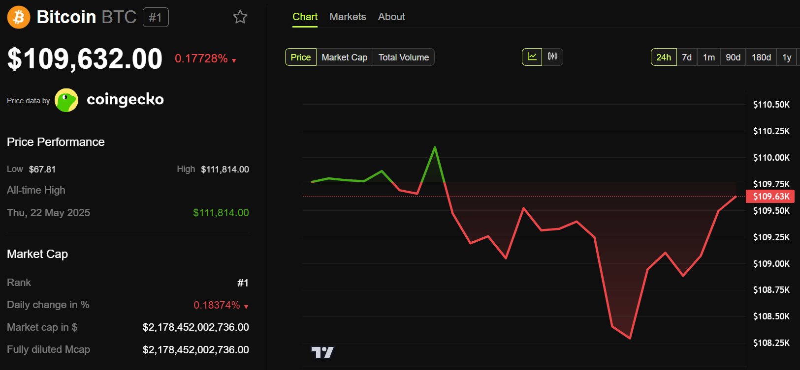 BeInCrypto деректері бойынша, осы жазба кезінде Bitcoin 109 632 долларға саудаланып, соңғы 24 сағатта 0,17%-ға төмендеді.
