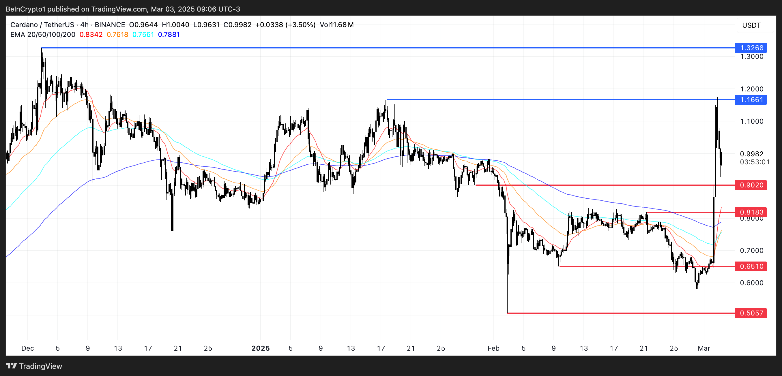 Cardano (ADA) кеше Дональд Трамп ADA-ның АҚШ крипто резервіне қосылатынын жариялаған соң 60%-ға өсіп, бағасы 1,10 доллардан жоғары көтерілді. Бұл үлкен ралли күшті бұқа импульсін тудырып, BBTrend және DMI сияқты негізгі индикаторлар өсу трендінің күшін растады.