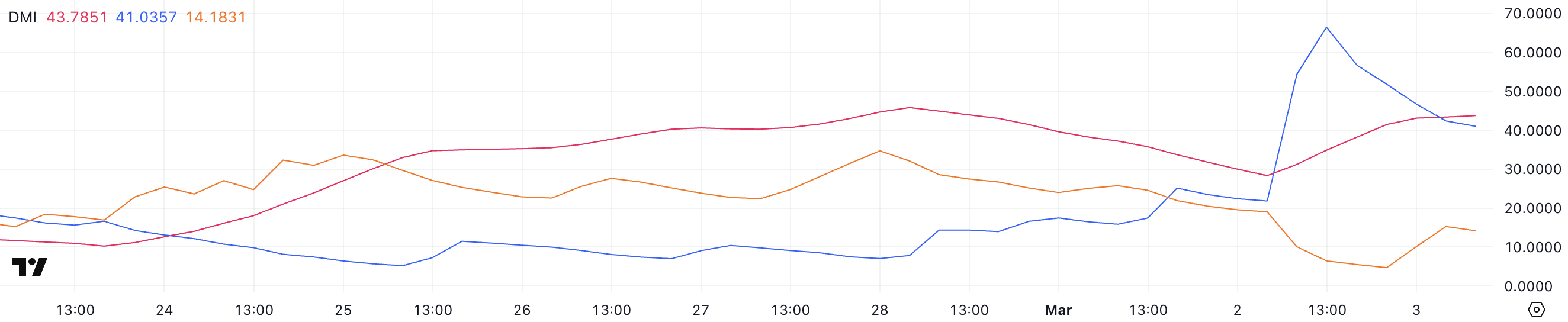 Cardano тренд күшінің айтарлықтай өсуін байқады, бұл оның Бағыттық қозғалыс индексінде (DMI) көрініс тапты. Трендтің күшін өлшейтін Орташа бағыттық индекс (ADX) ADA-ның АҚШ крипто резервіне қосылуы туралы хабарландырудан кейін 28,3-тен 43,7-ге дейін өсті.